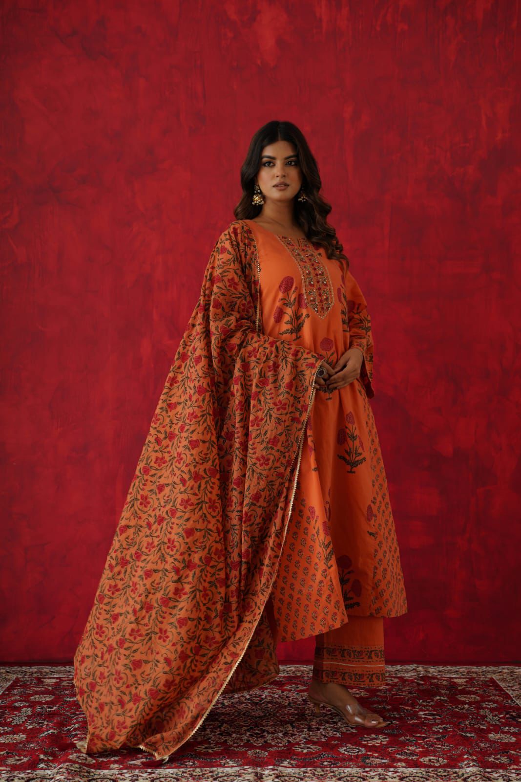 Vibrant Orange Floral Embroidered Suit Set