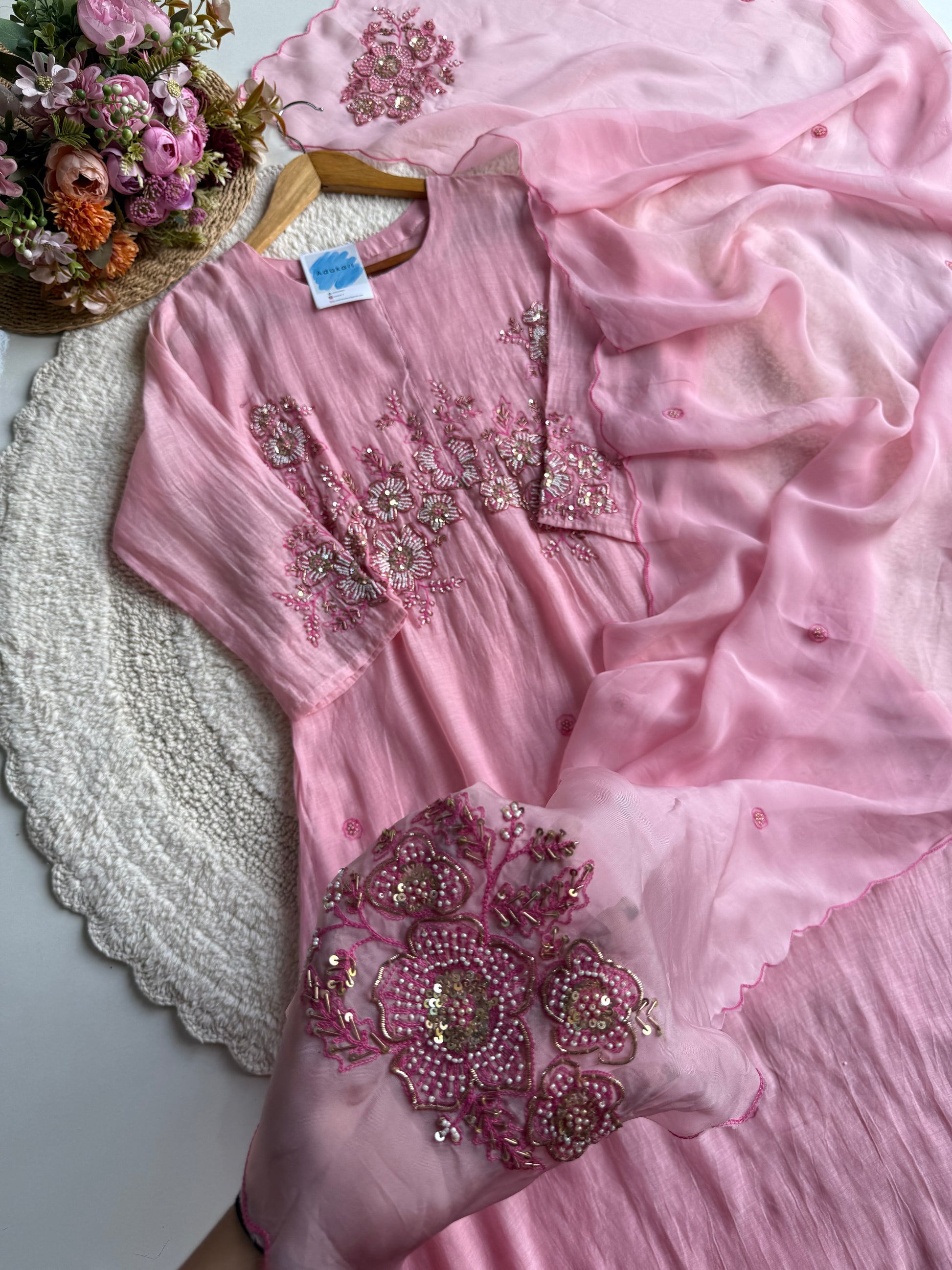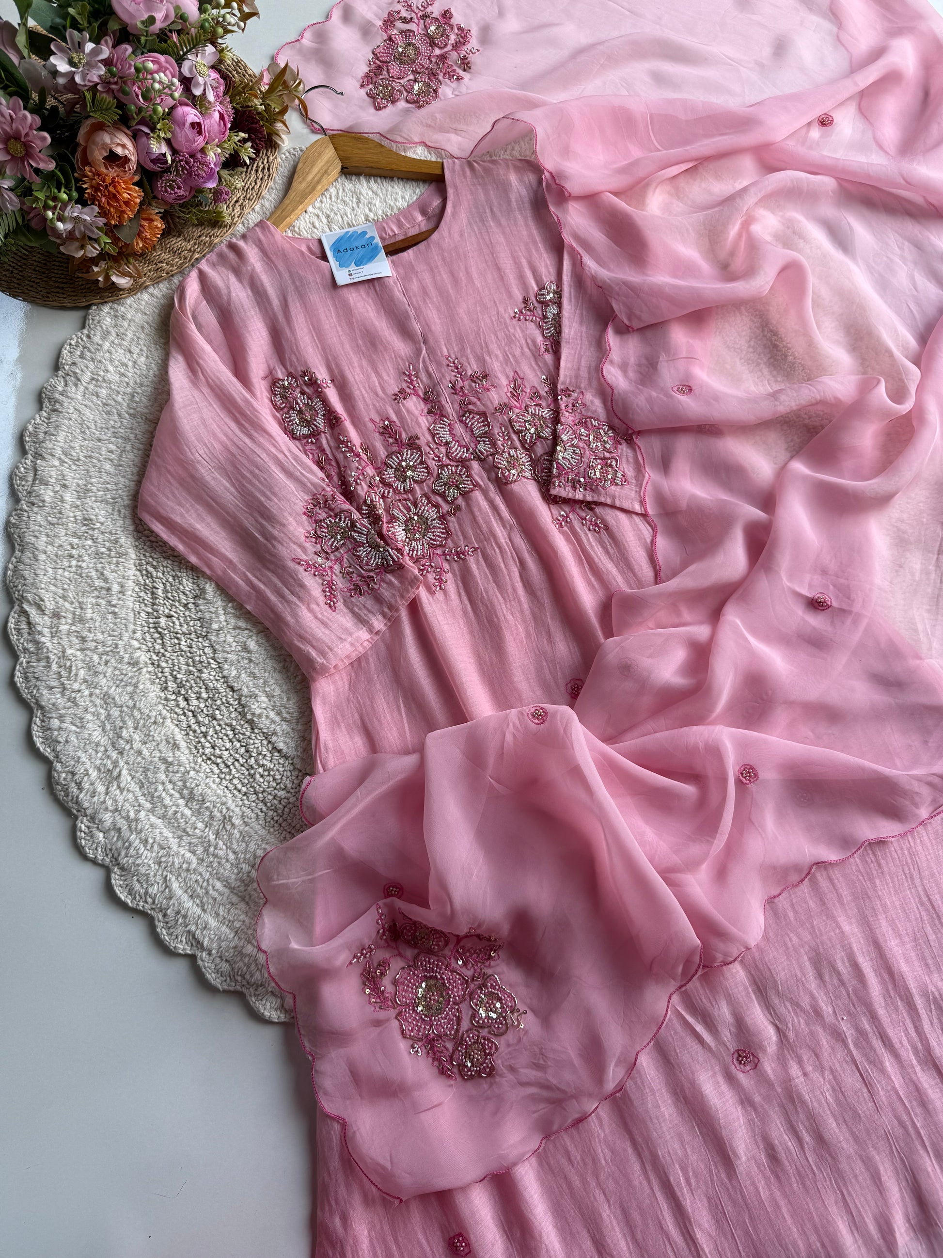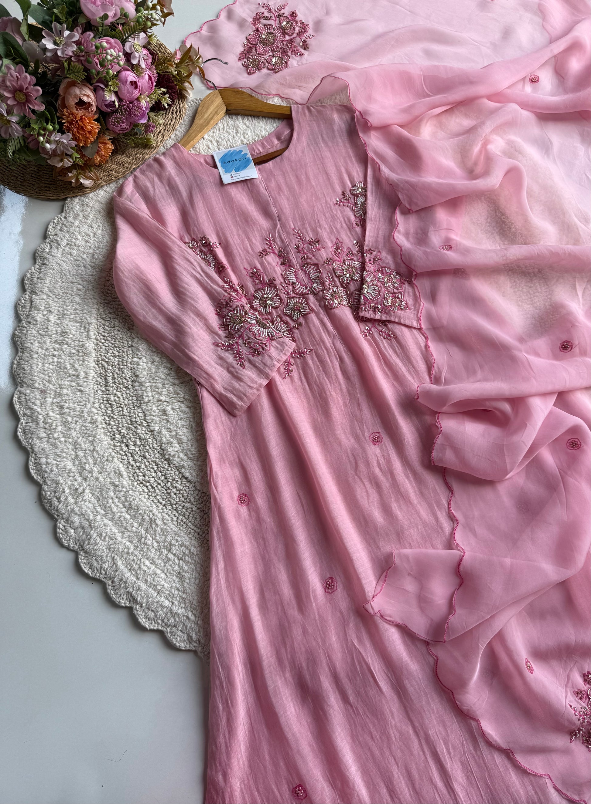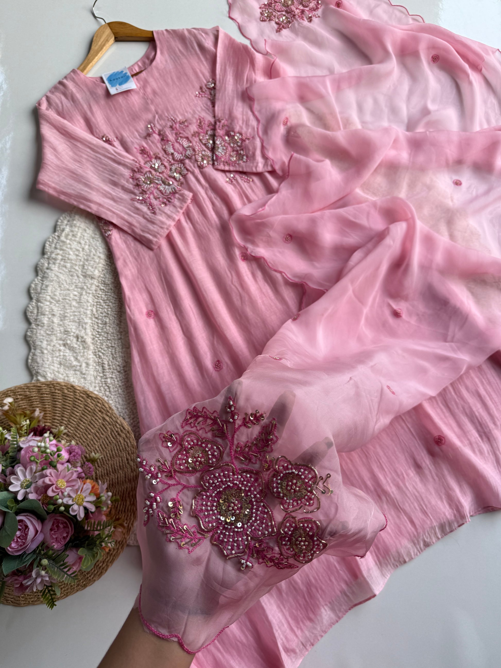 Paired with a Viscose Organza dupatta, adorned with refined motifs and scalloped edges, it radiates a soft, ethereal flow. The cotton bottom ensures comfort without compromising sophistication, making it perfect for both festive and daytime occasions.