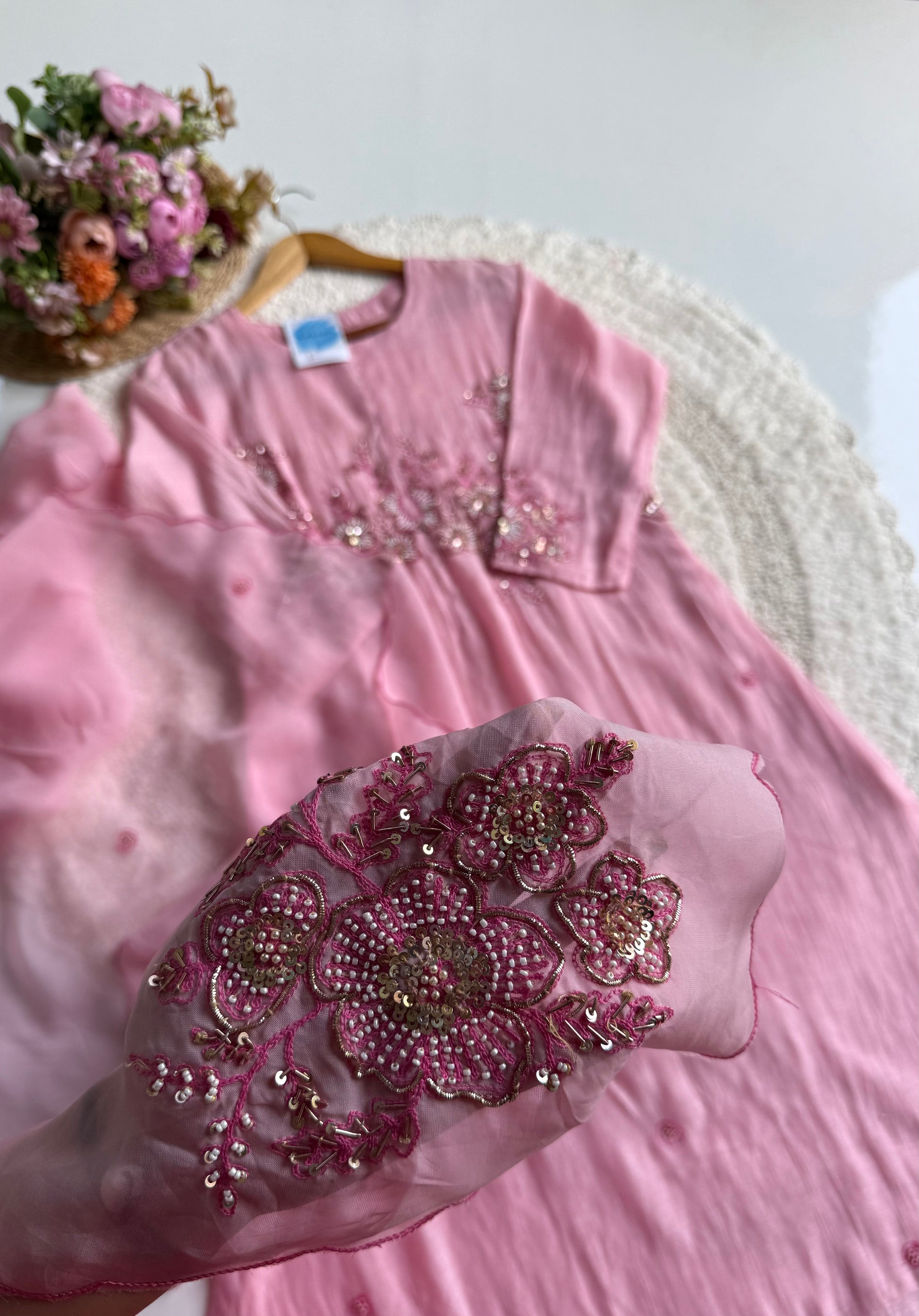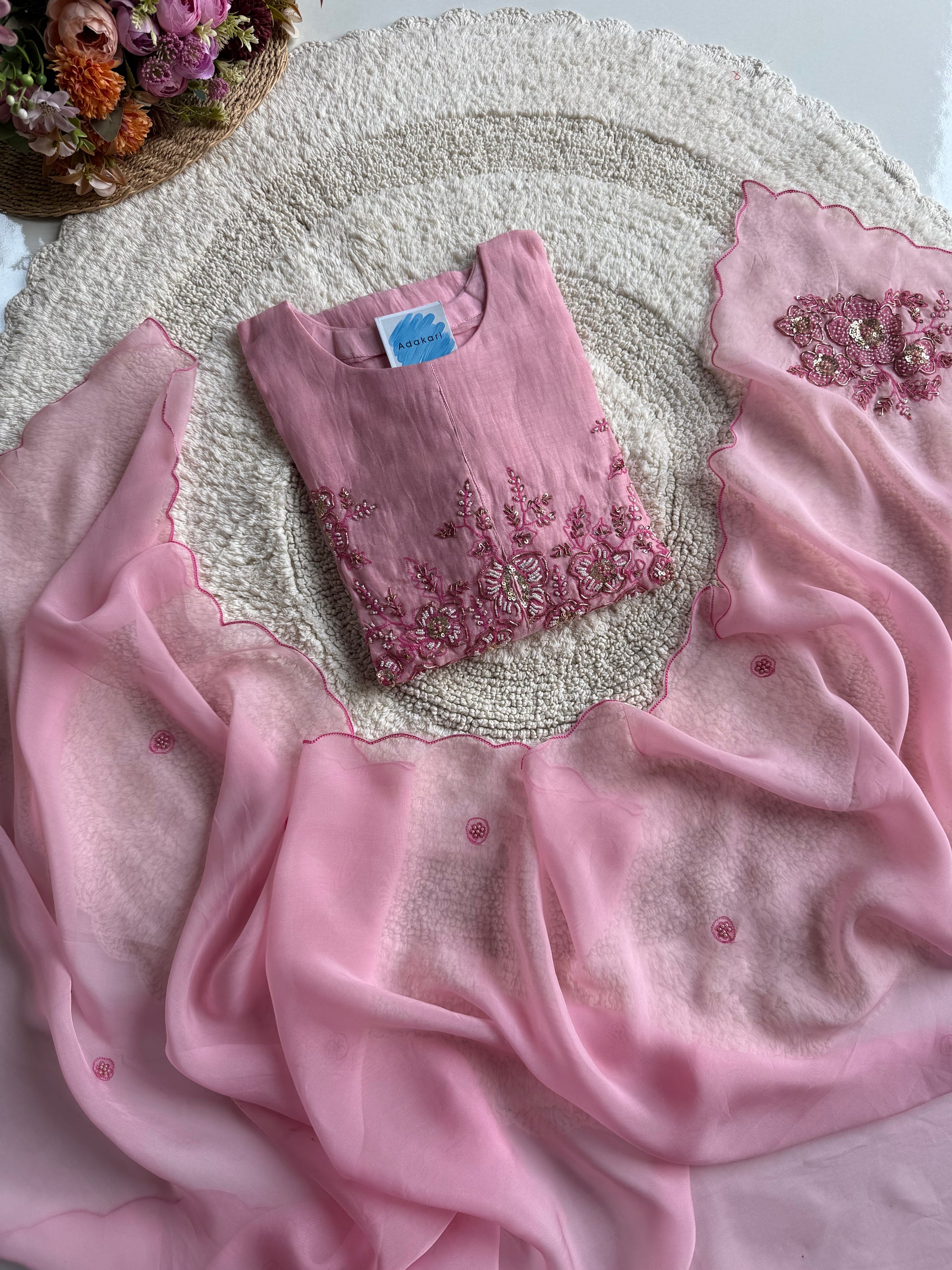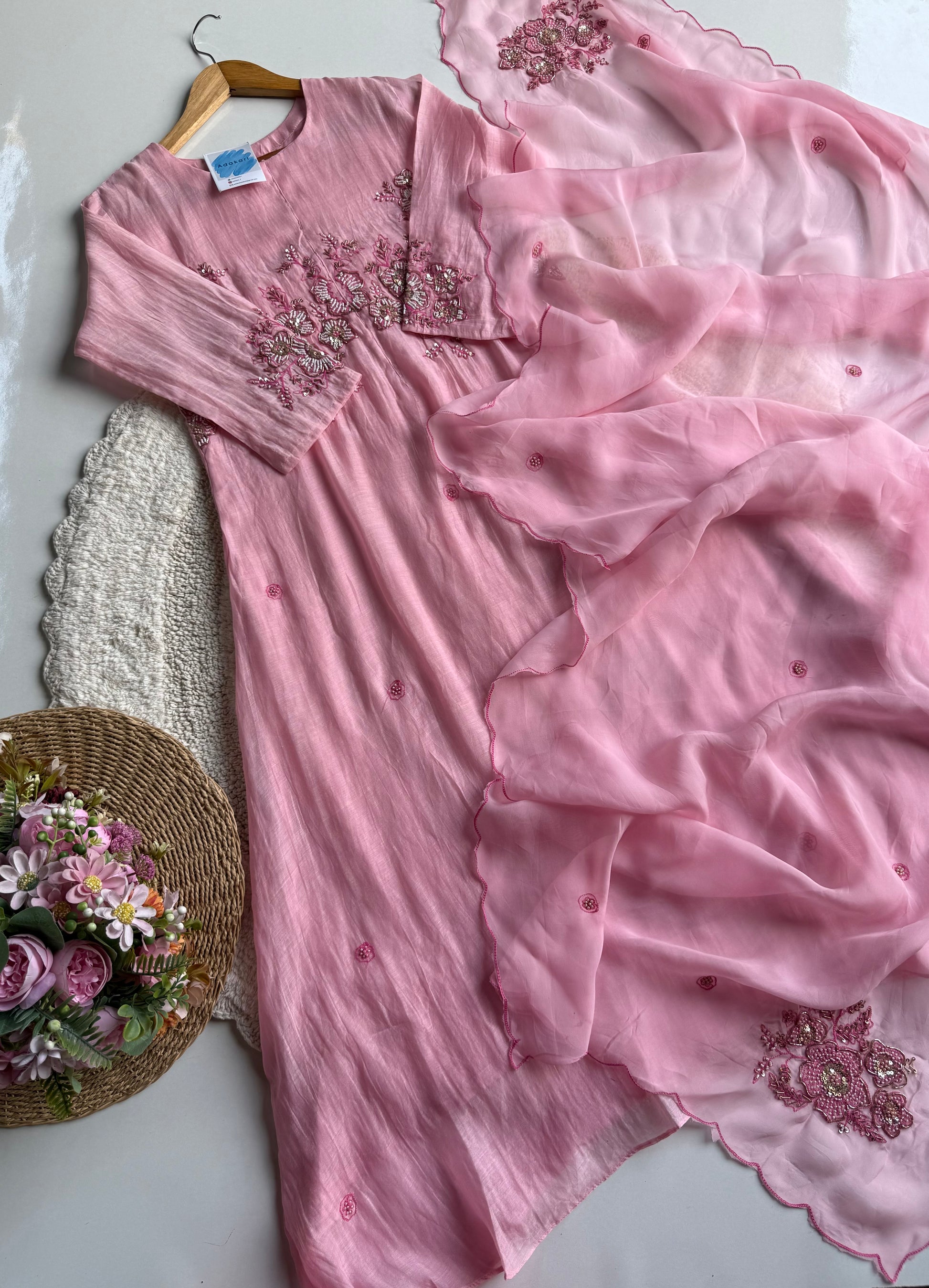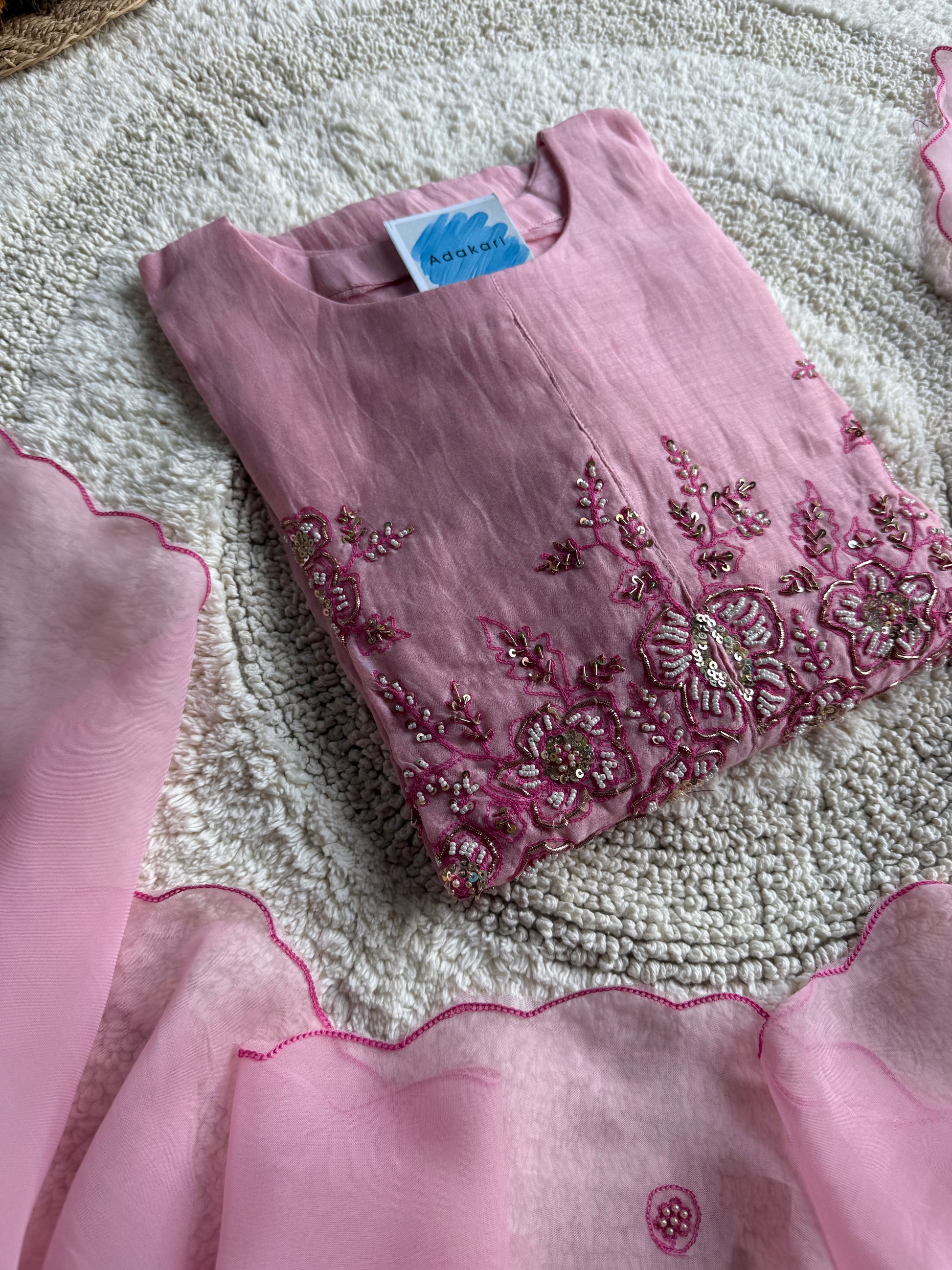 Paired with a Viscose Organza dupatta, adorned with refined motifs and scalloped edges, it radiates a soft, ethereal flow. The cotton bottom ensures comfort without compromising sophistication, making it perfect for both festive and daytime occasions.