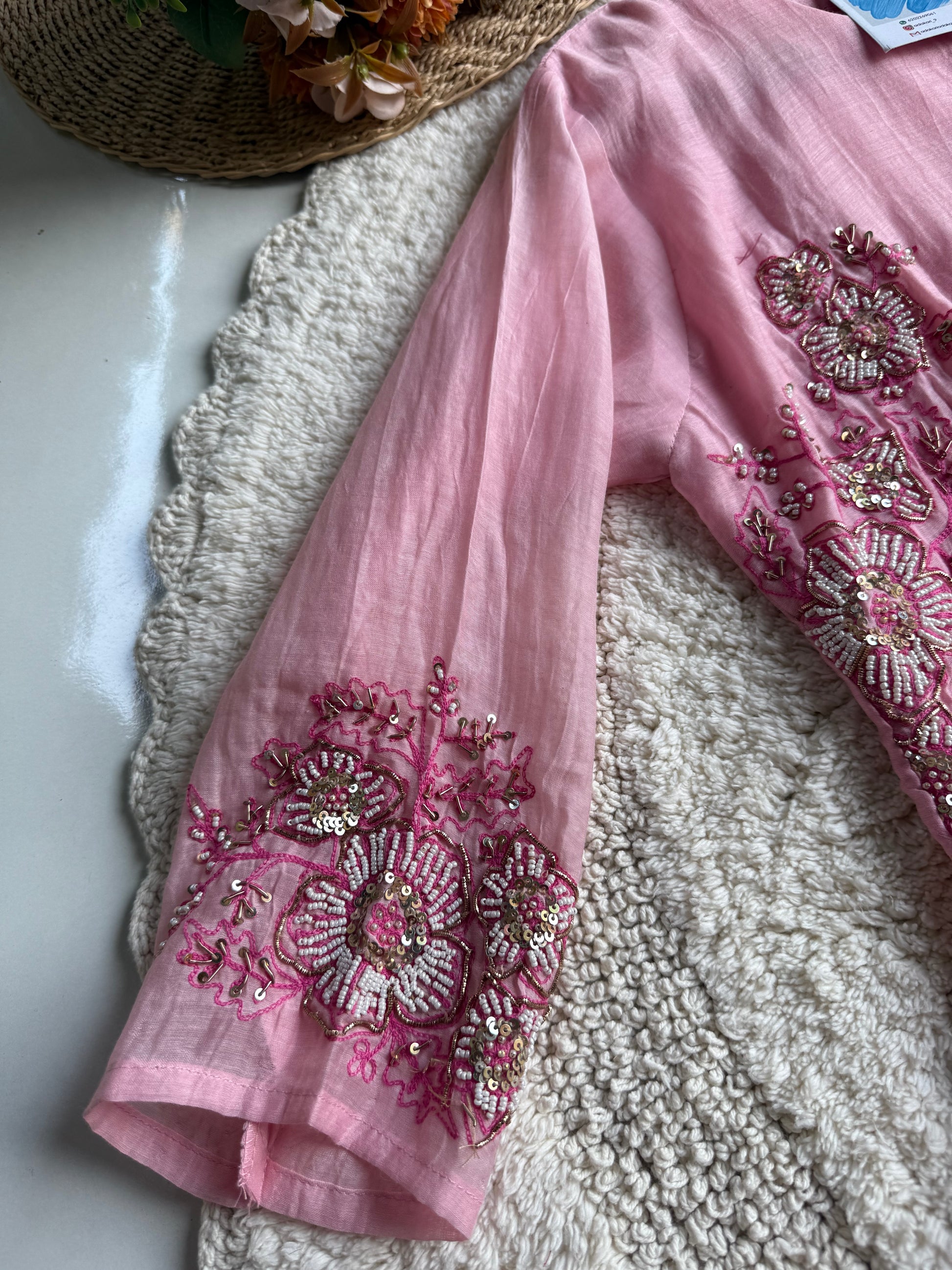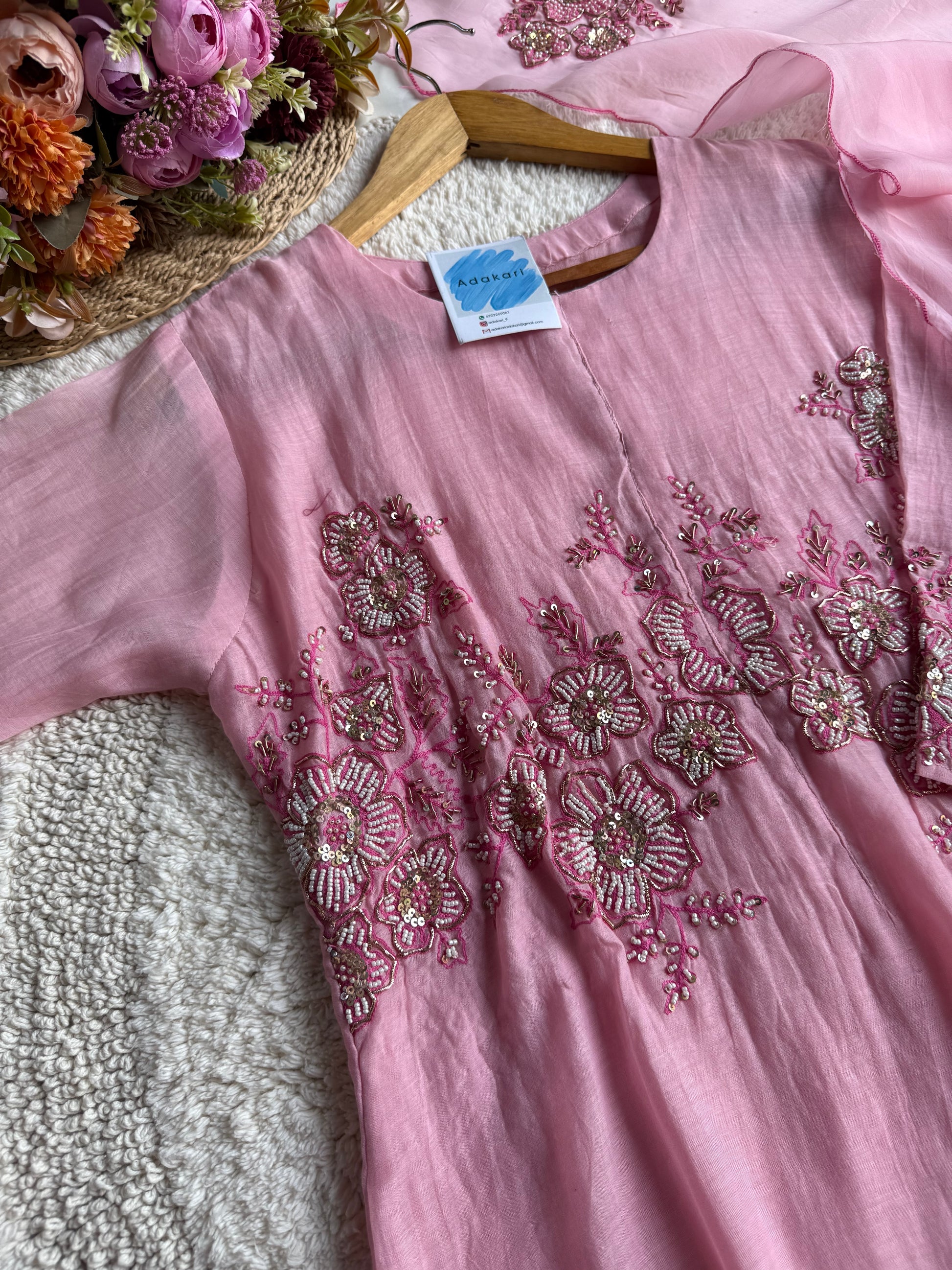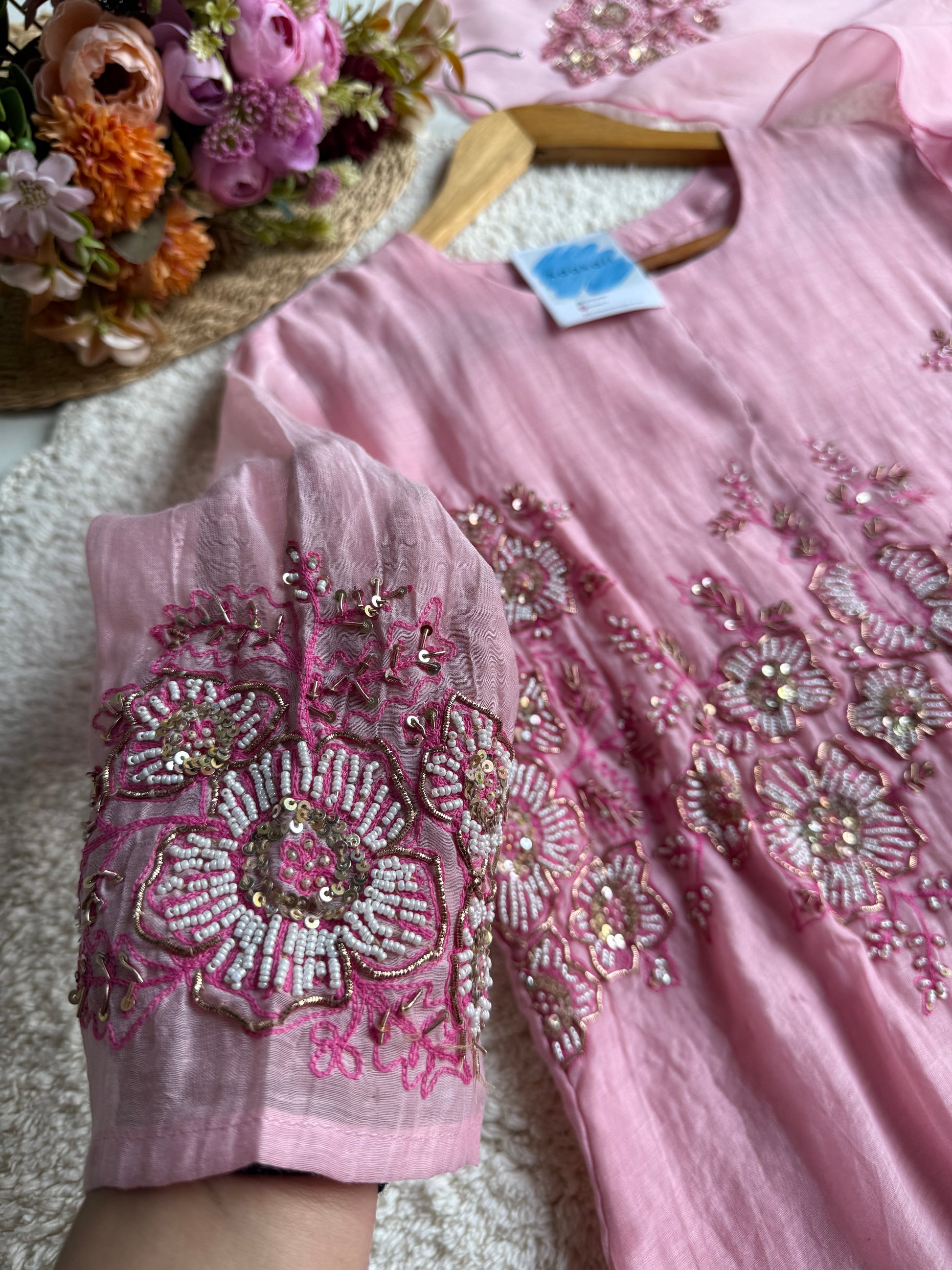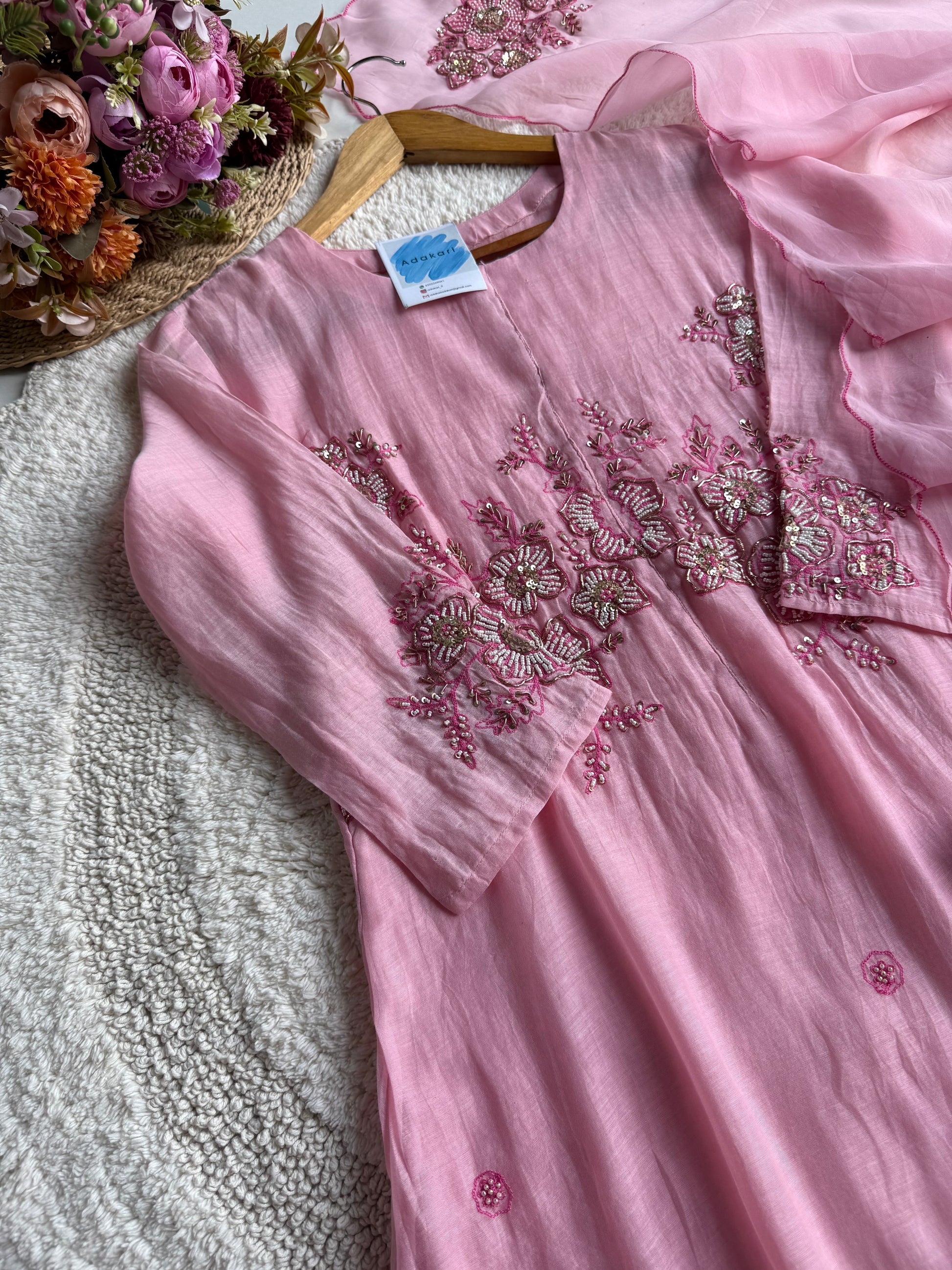 🧵 Work Details: Hand embroidery with floral accents on sleeves and dupatta motifs