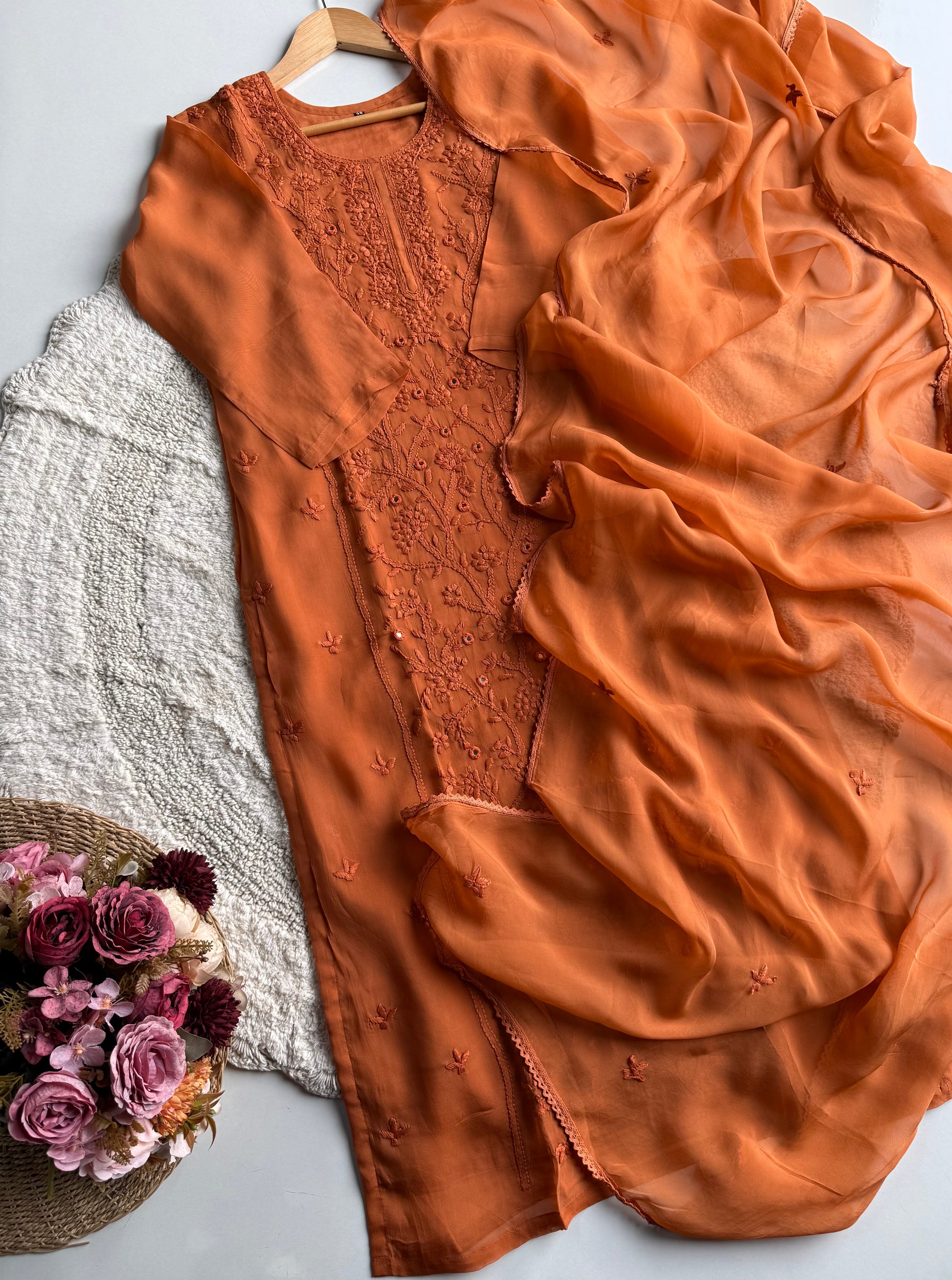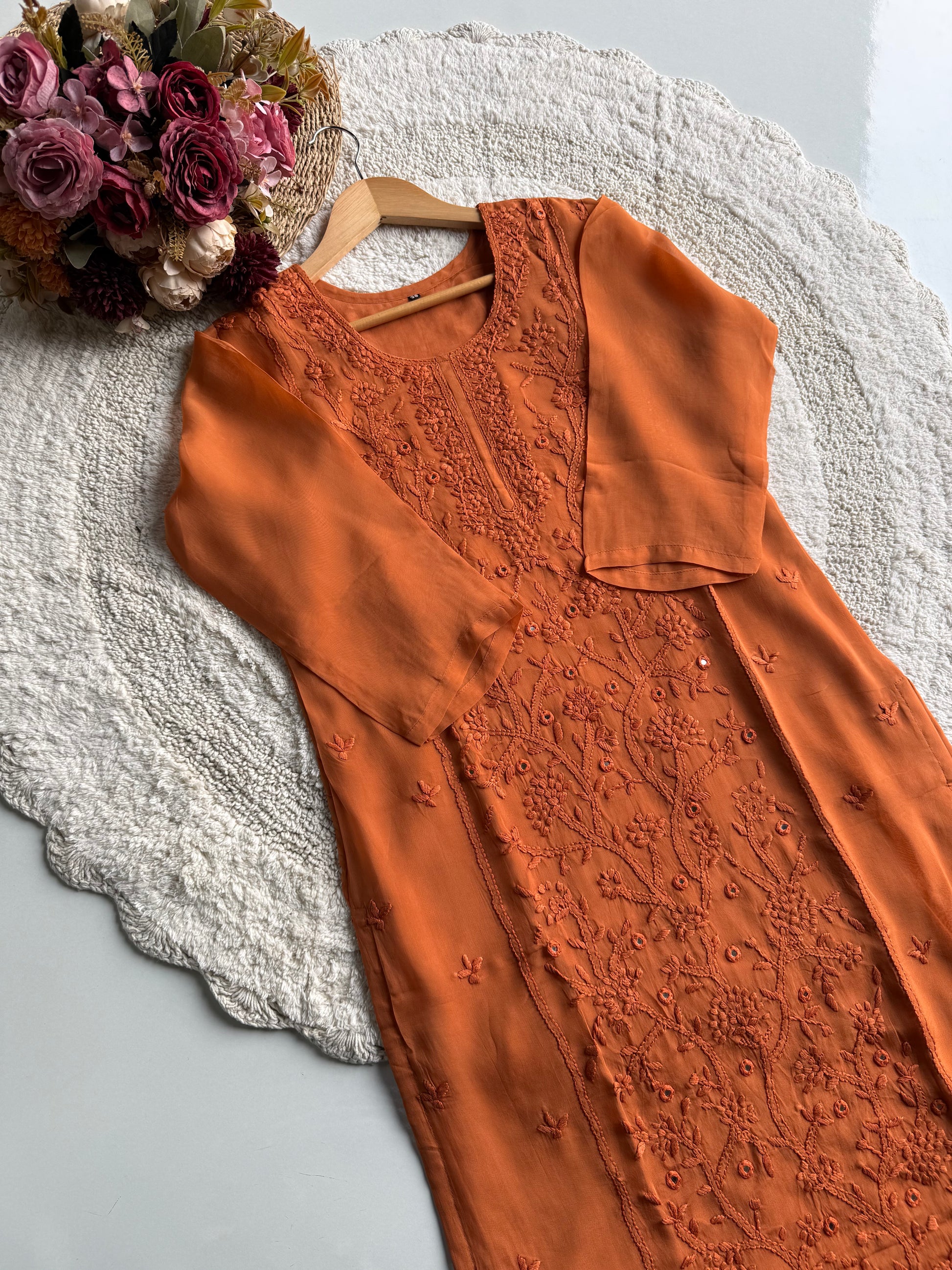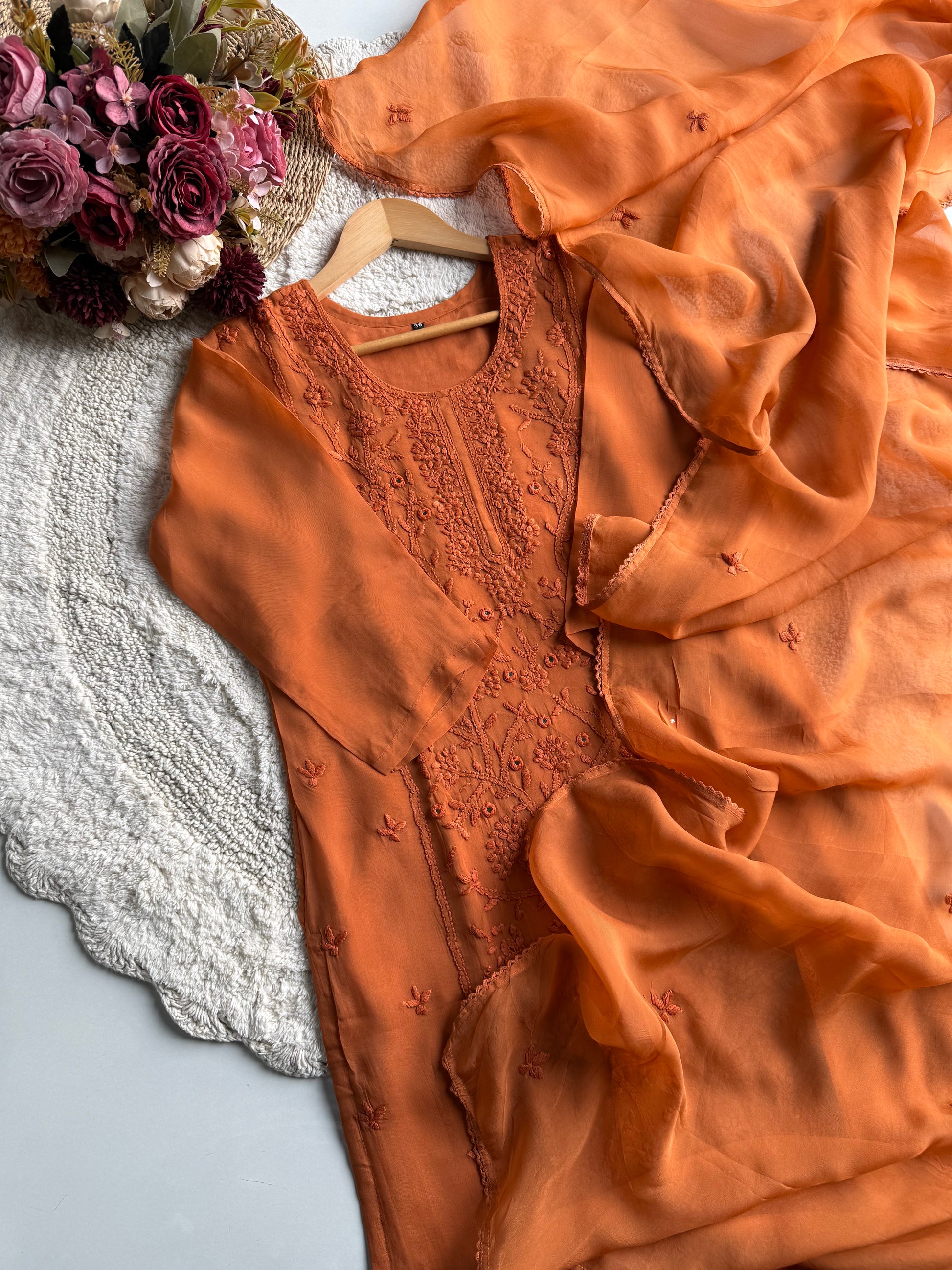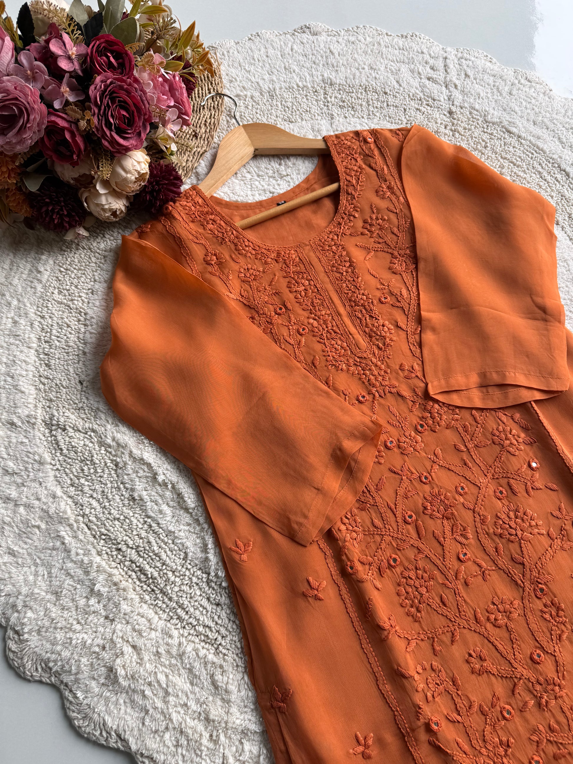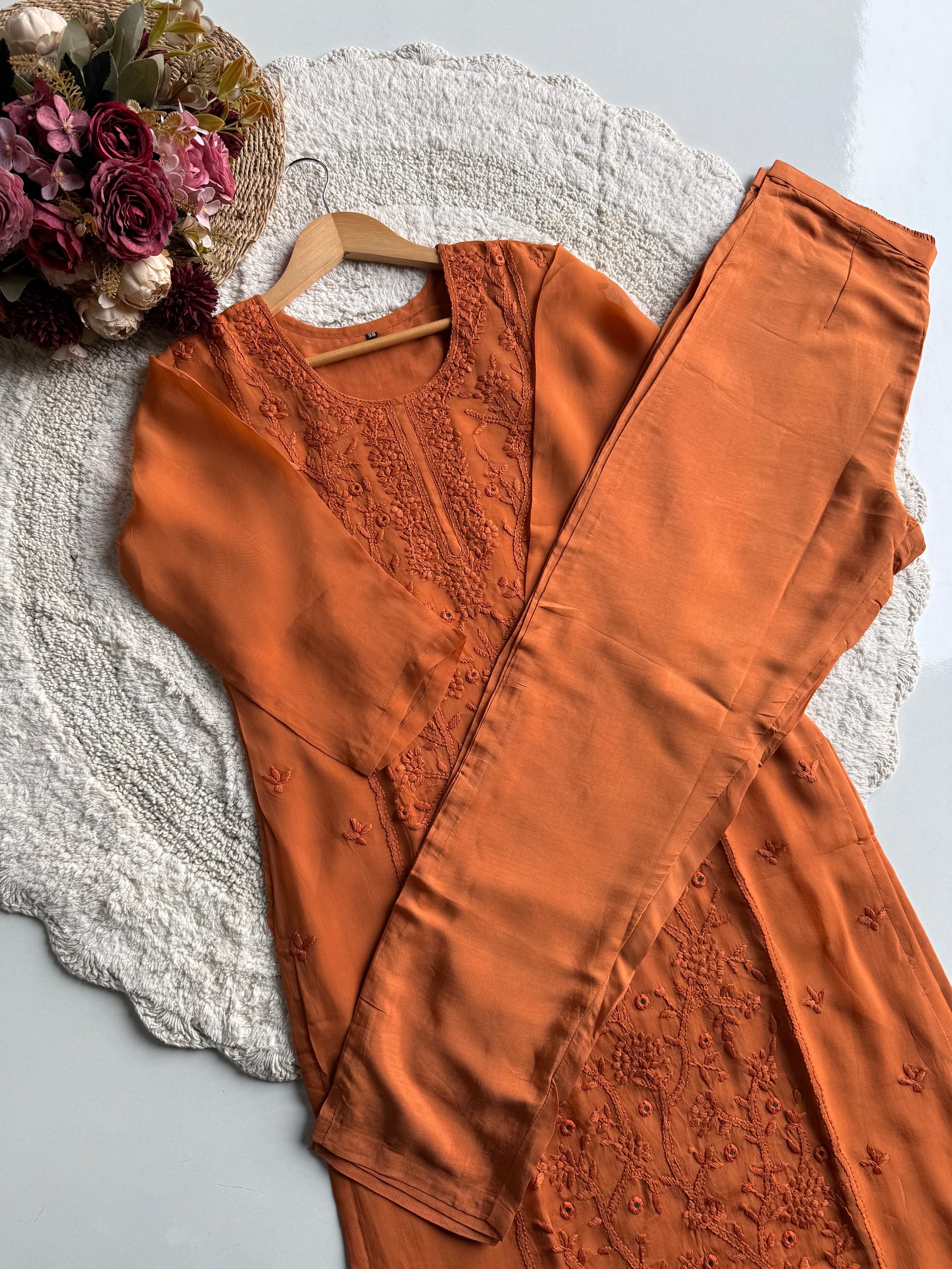 A beautifully crafted straight-cut viscose organza suit set in a rich orange hue, designed with delicate hand embroidery and mirror work. This outfit blends elegance with comfort, making it perfect for festive wear, day functions, and special occasions.