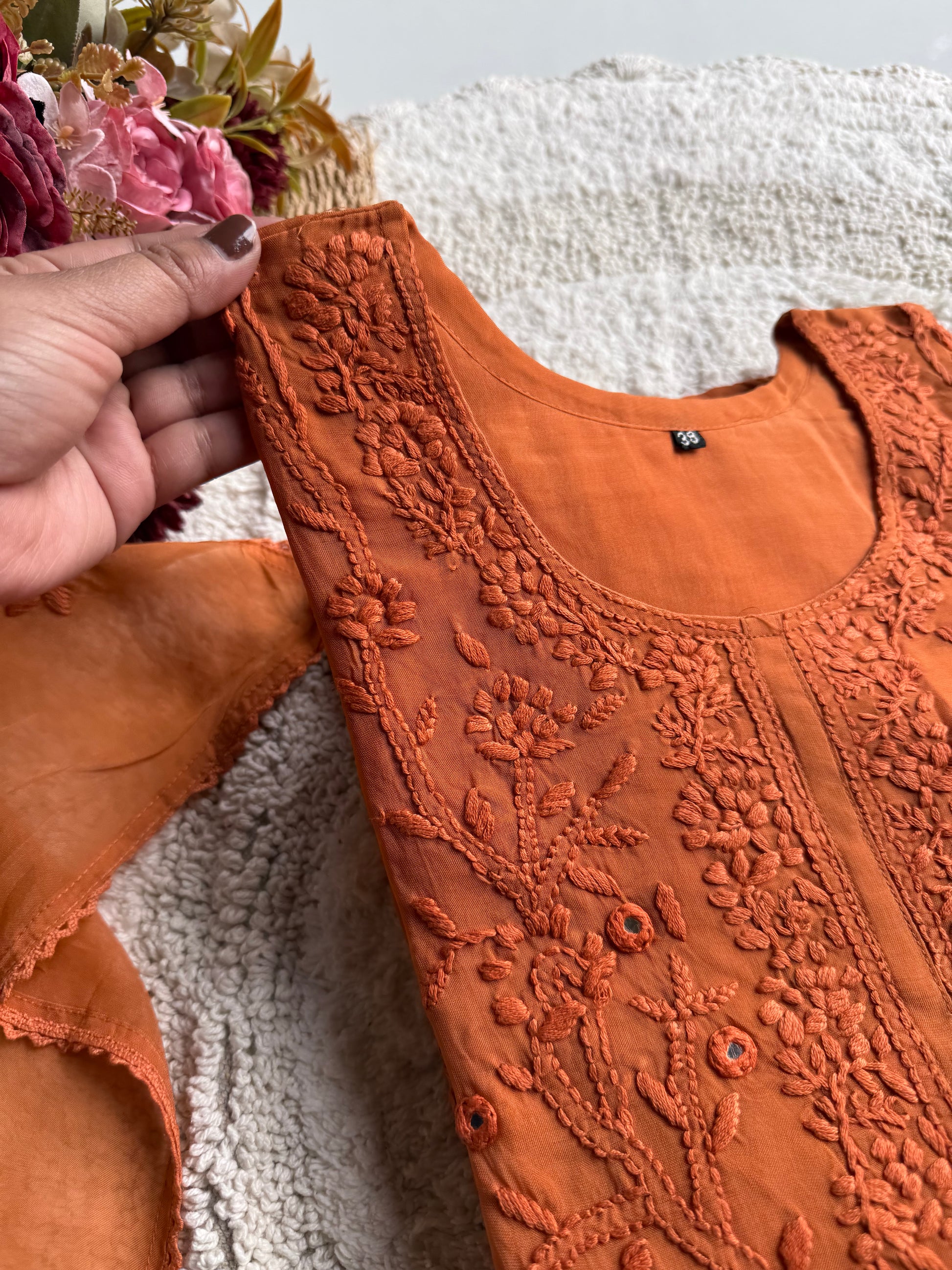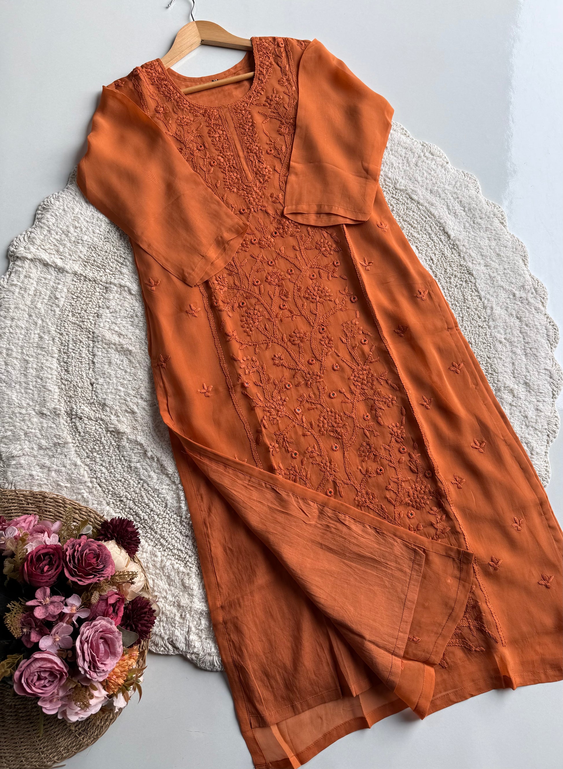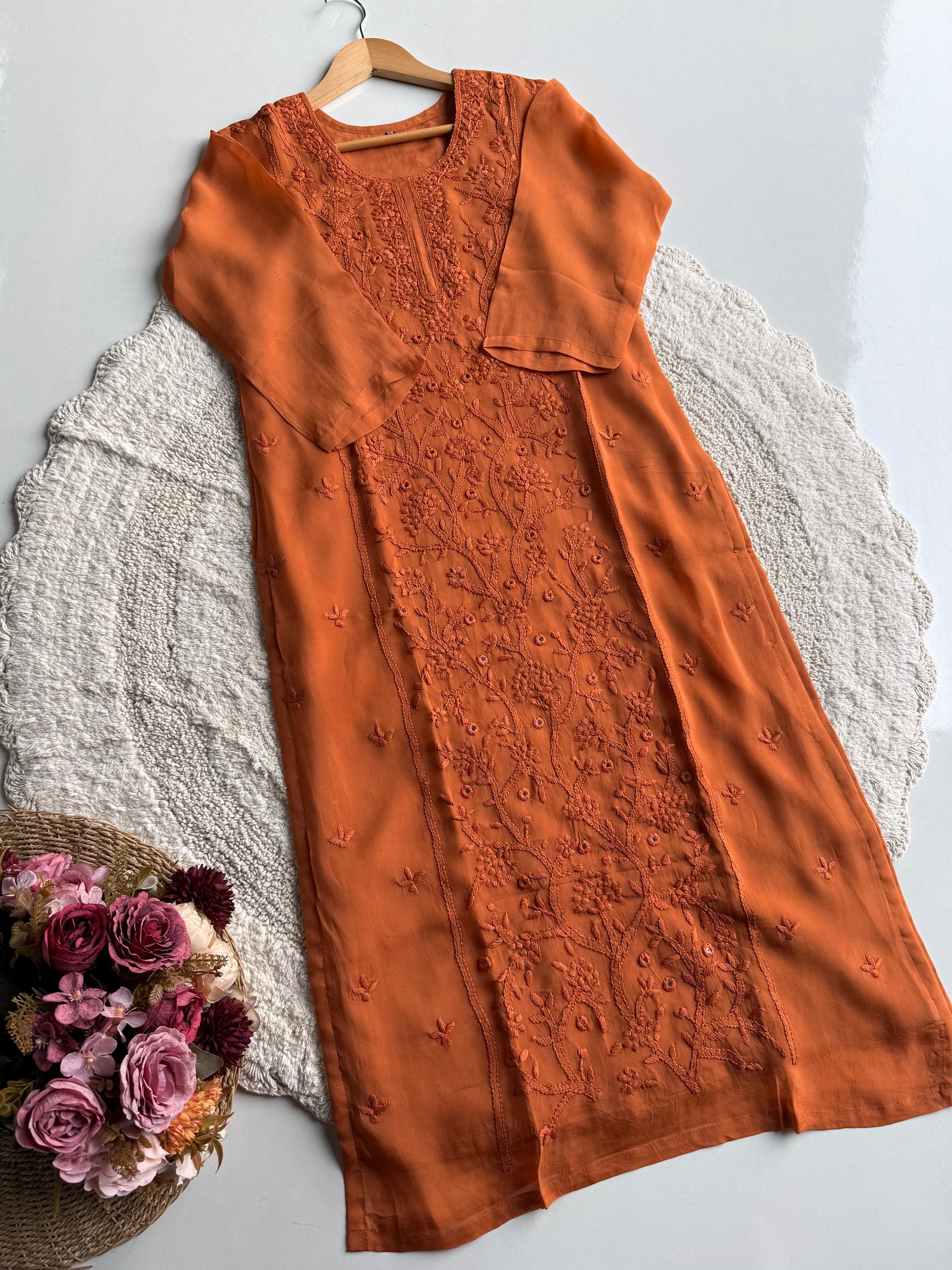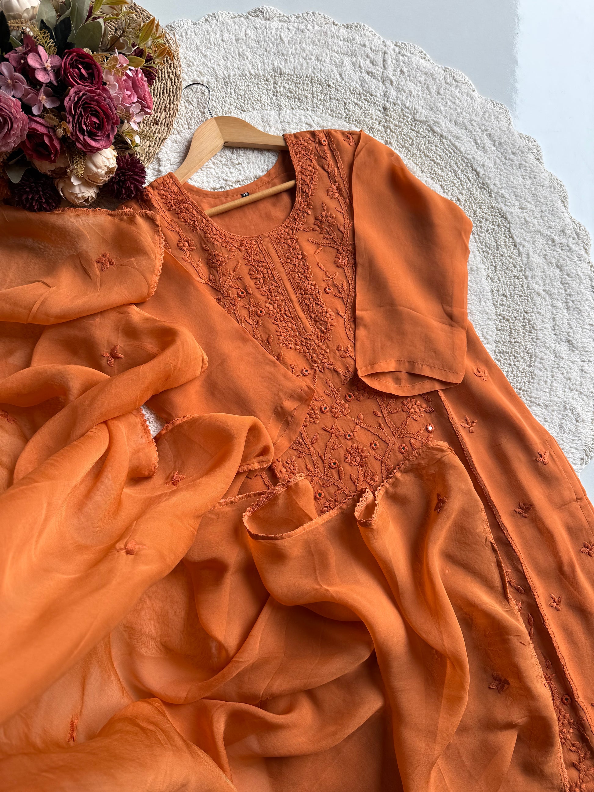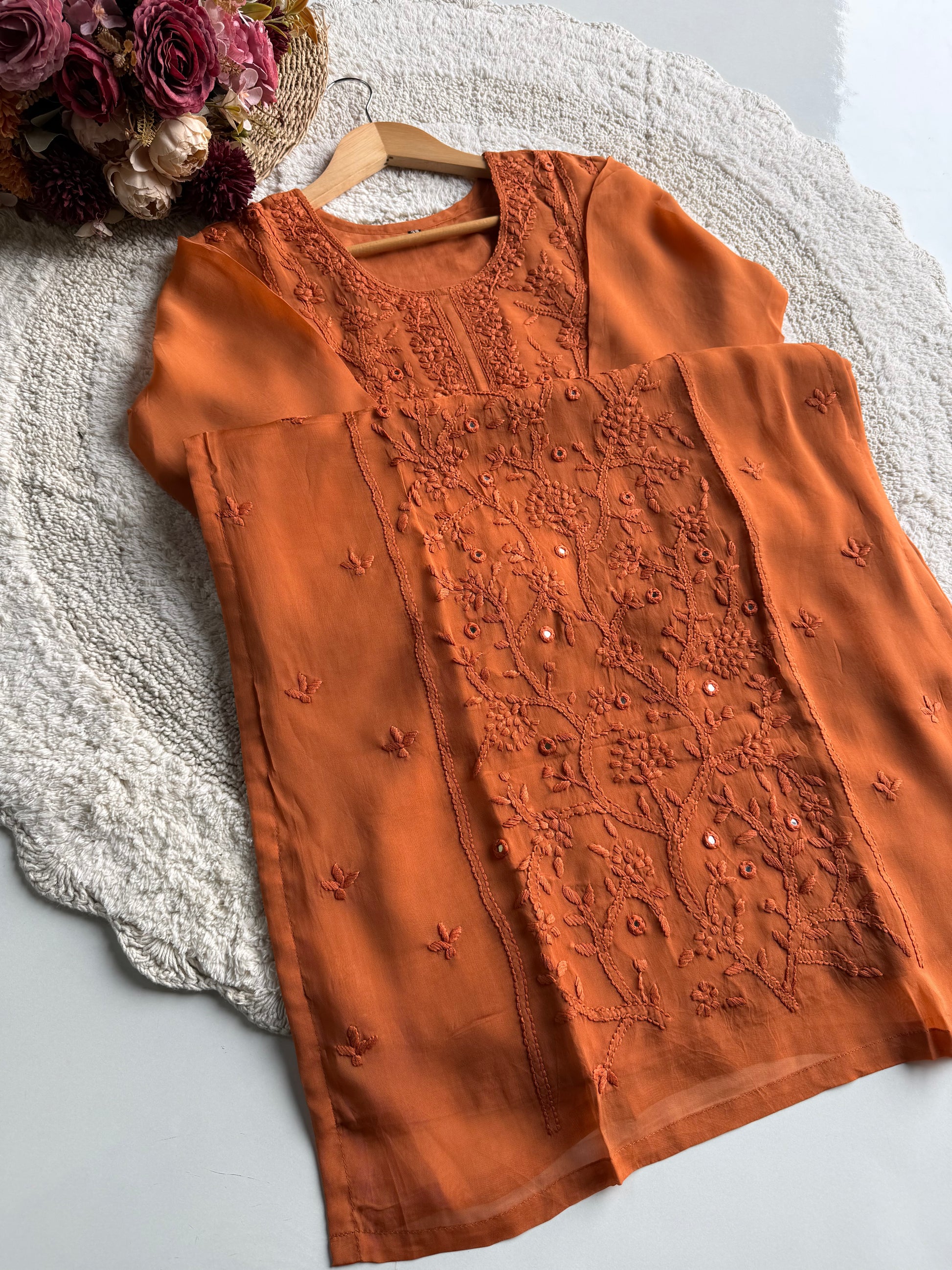 A beautifully crafted straight-cut viscose organza suit set in a rich orange hue, designed with delicate hand embroidery and mirror work. This outfit blends elegance with comfort, making it perfect for festive wear, day functions, and special occasions.