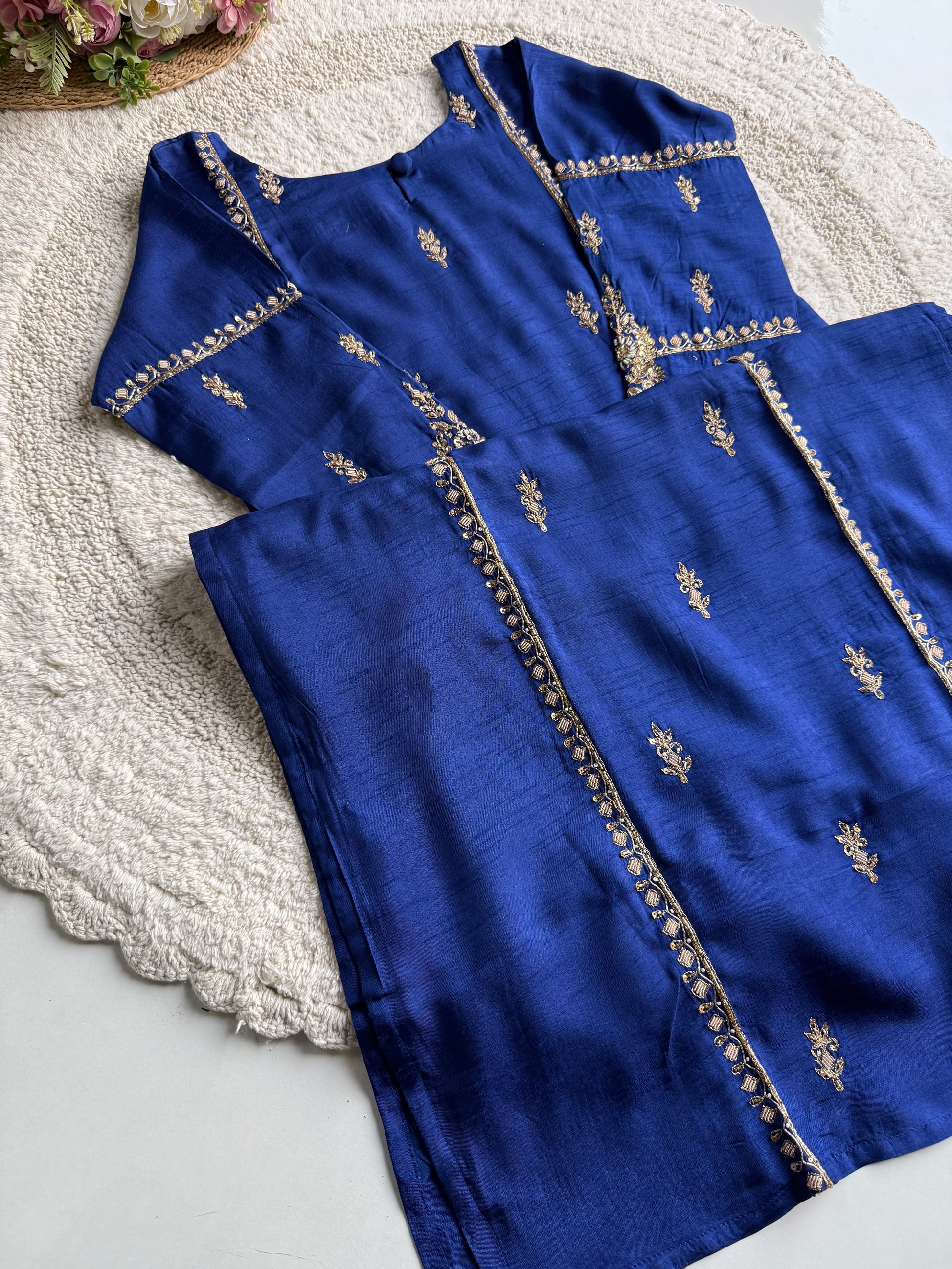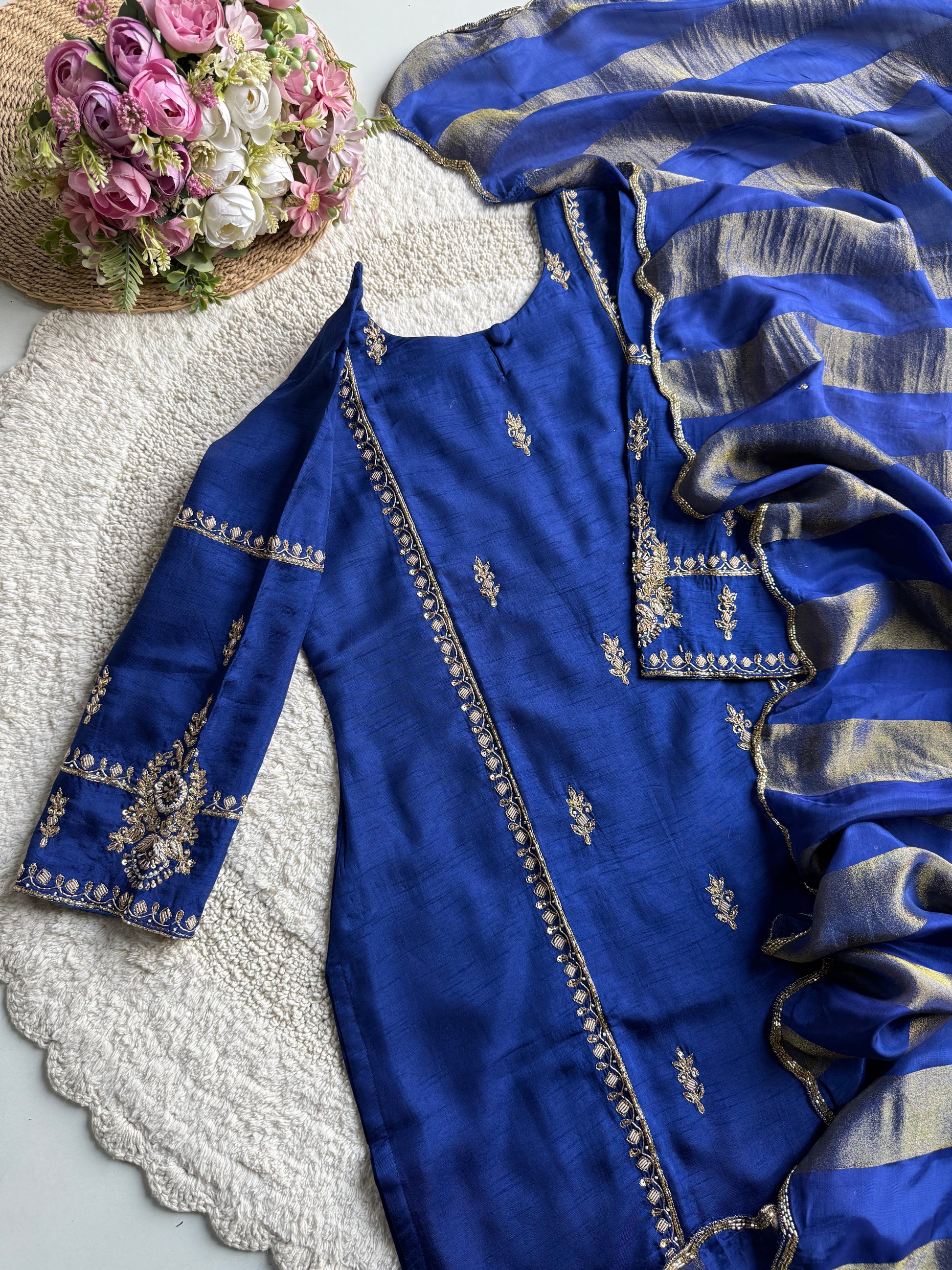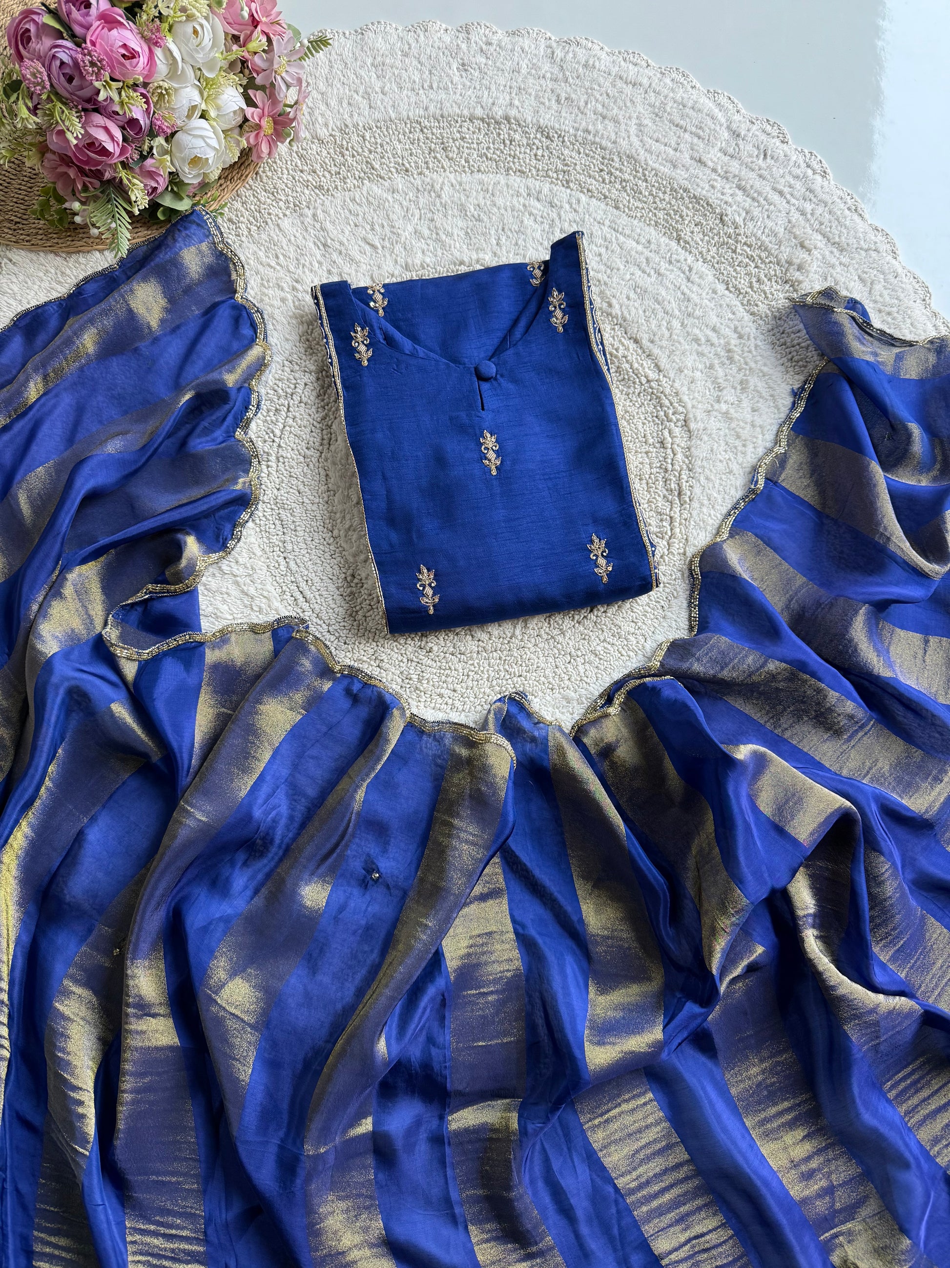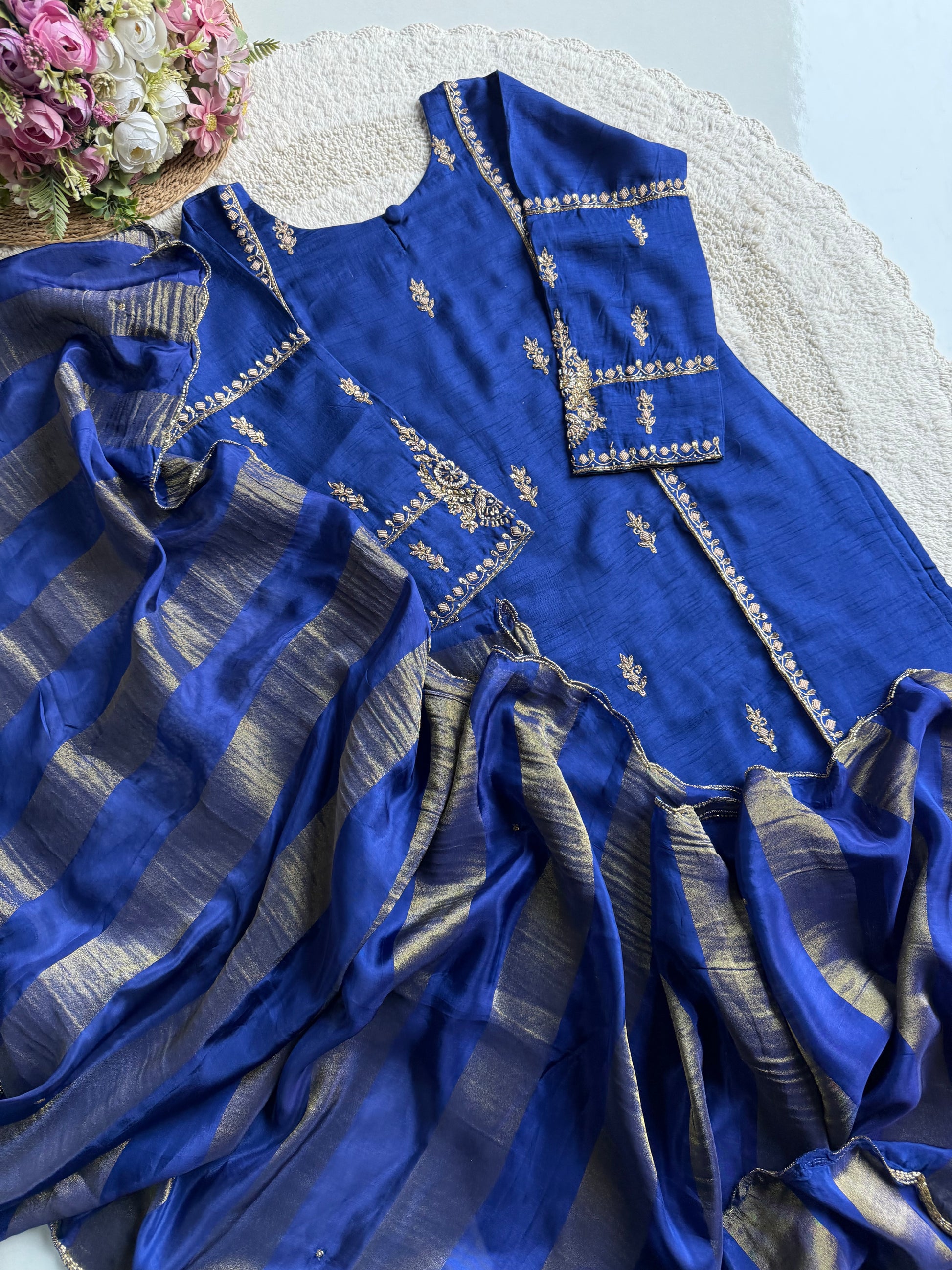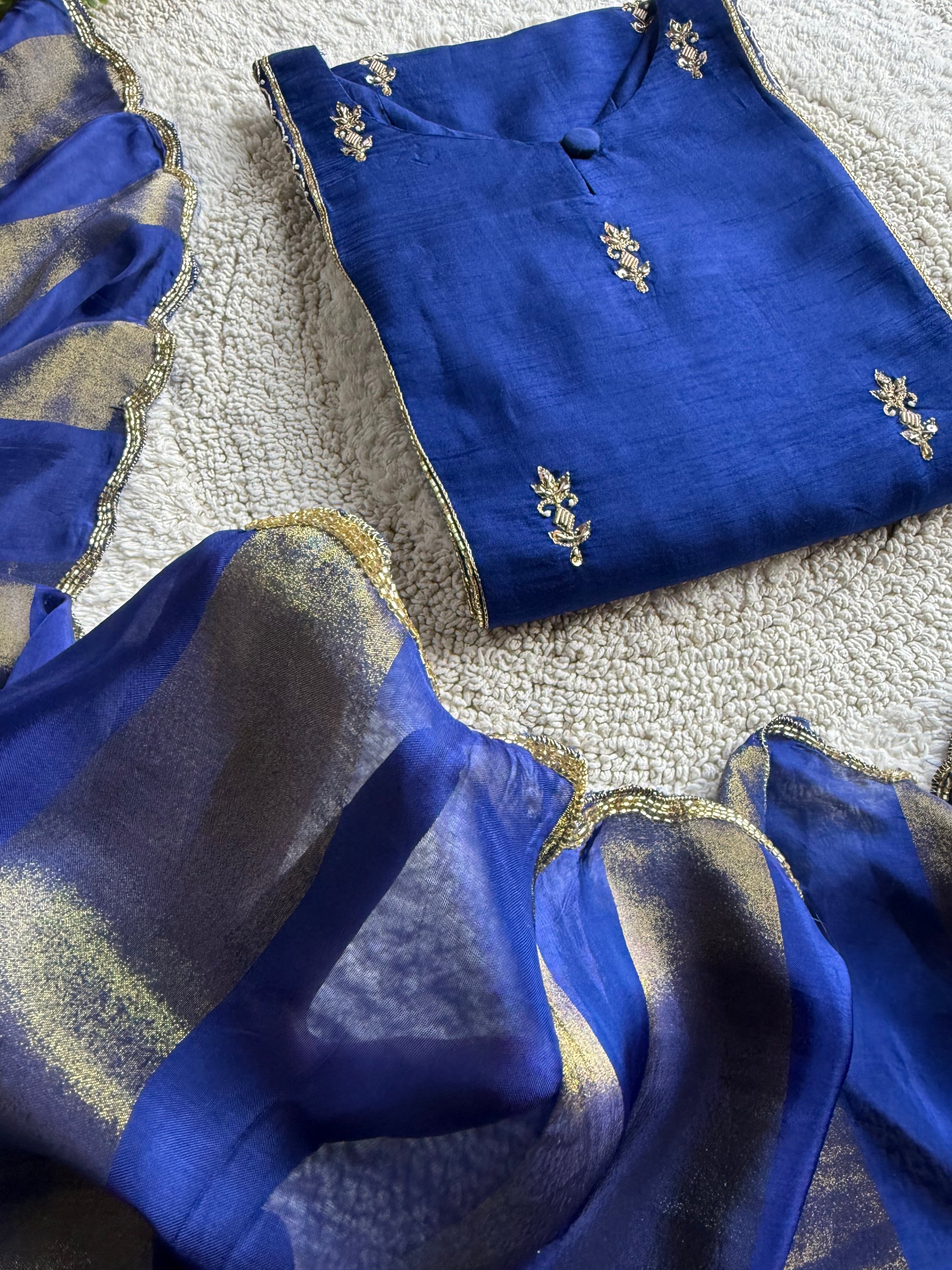 A premium handcrafted Royal Blue Dola Silk Kurta–Plazo set adorned with intricate handwork on the neckline, sleeves, and front panel. Paired with a rich silk Dupatta featuring golden striped detailing and scalloped handwork, this set offers a regal, festive-ready look with complete cotton lining top