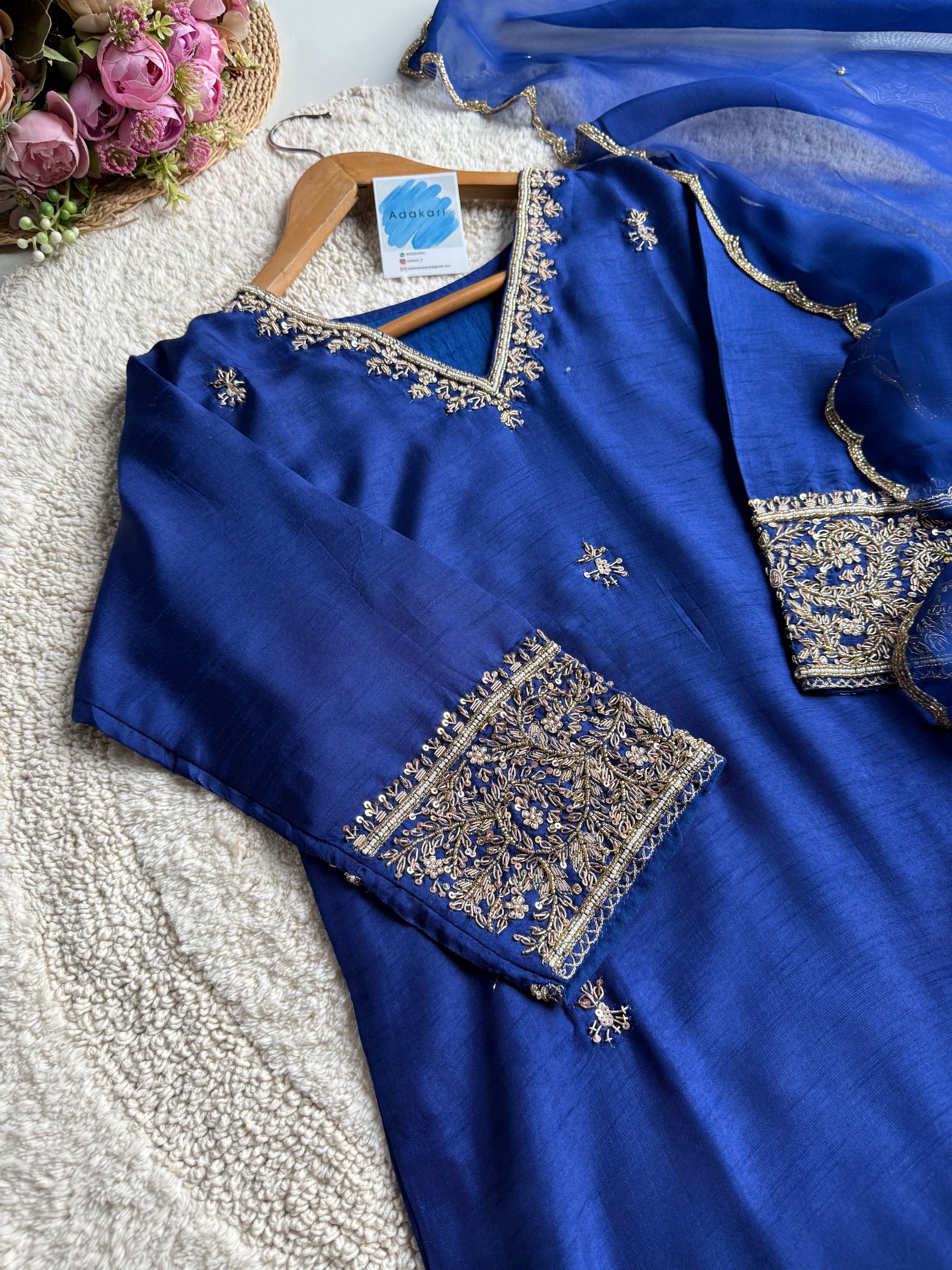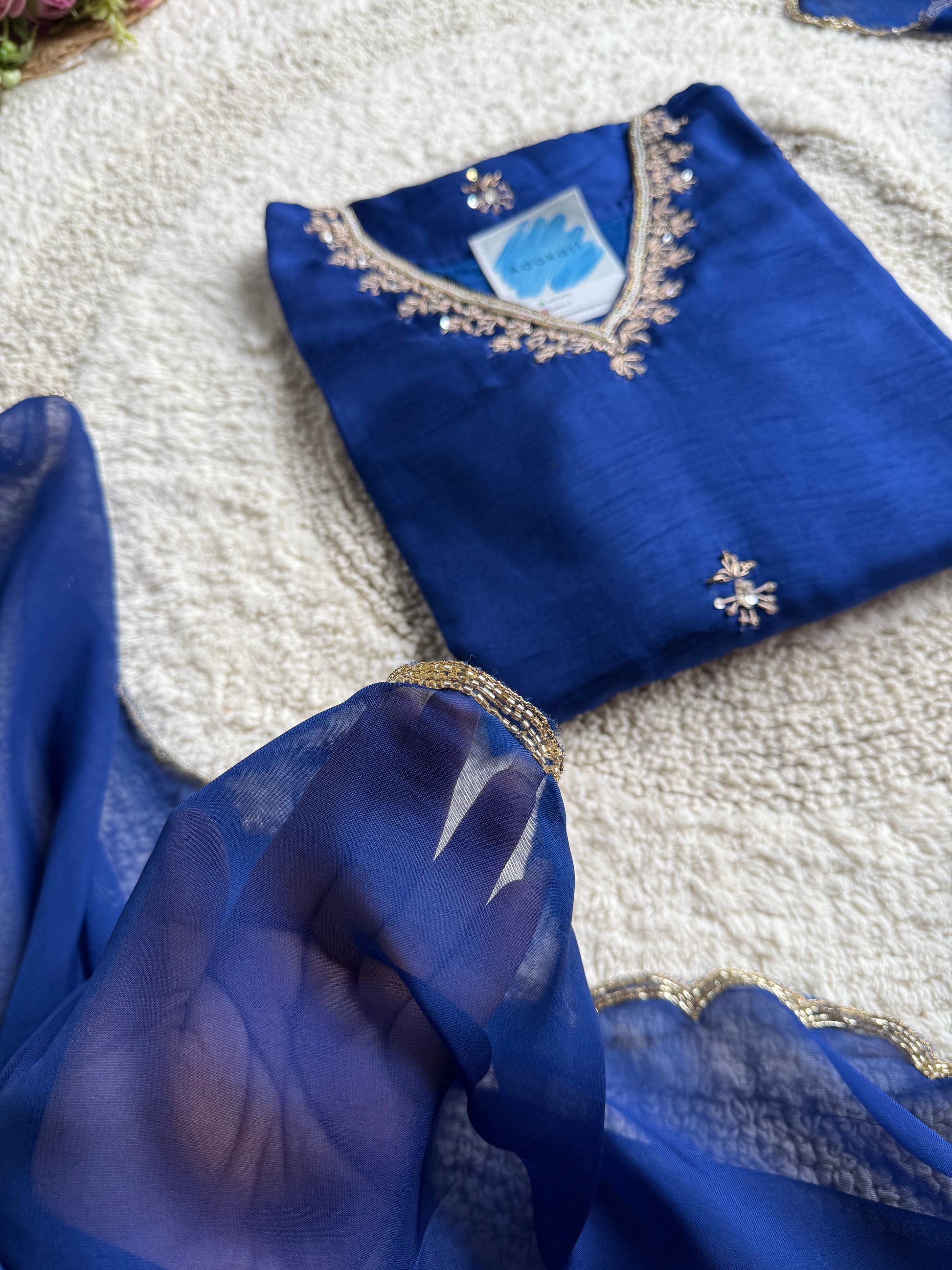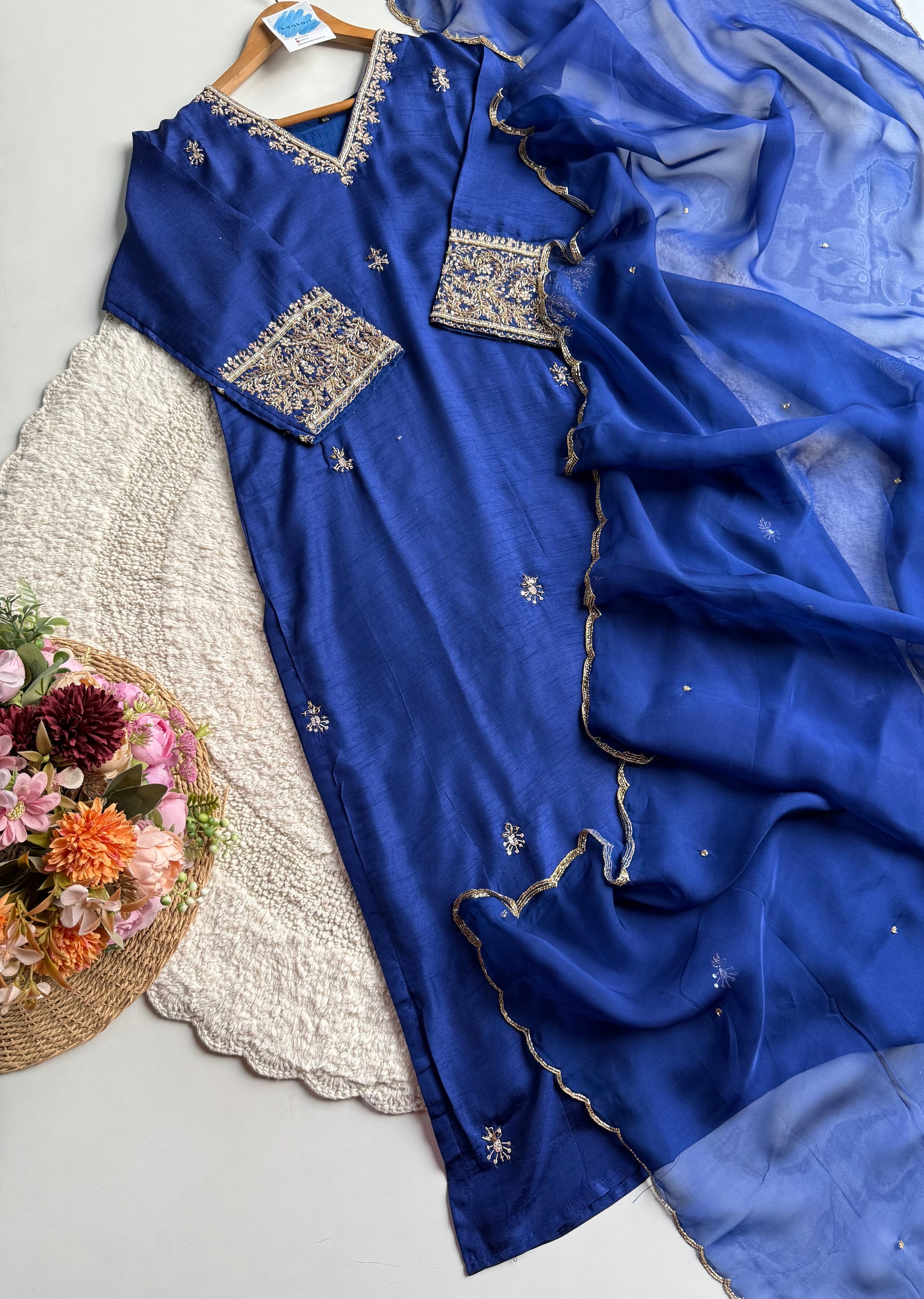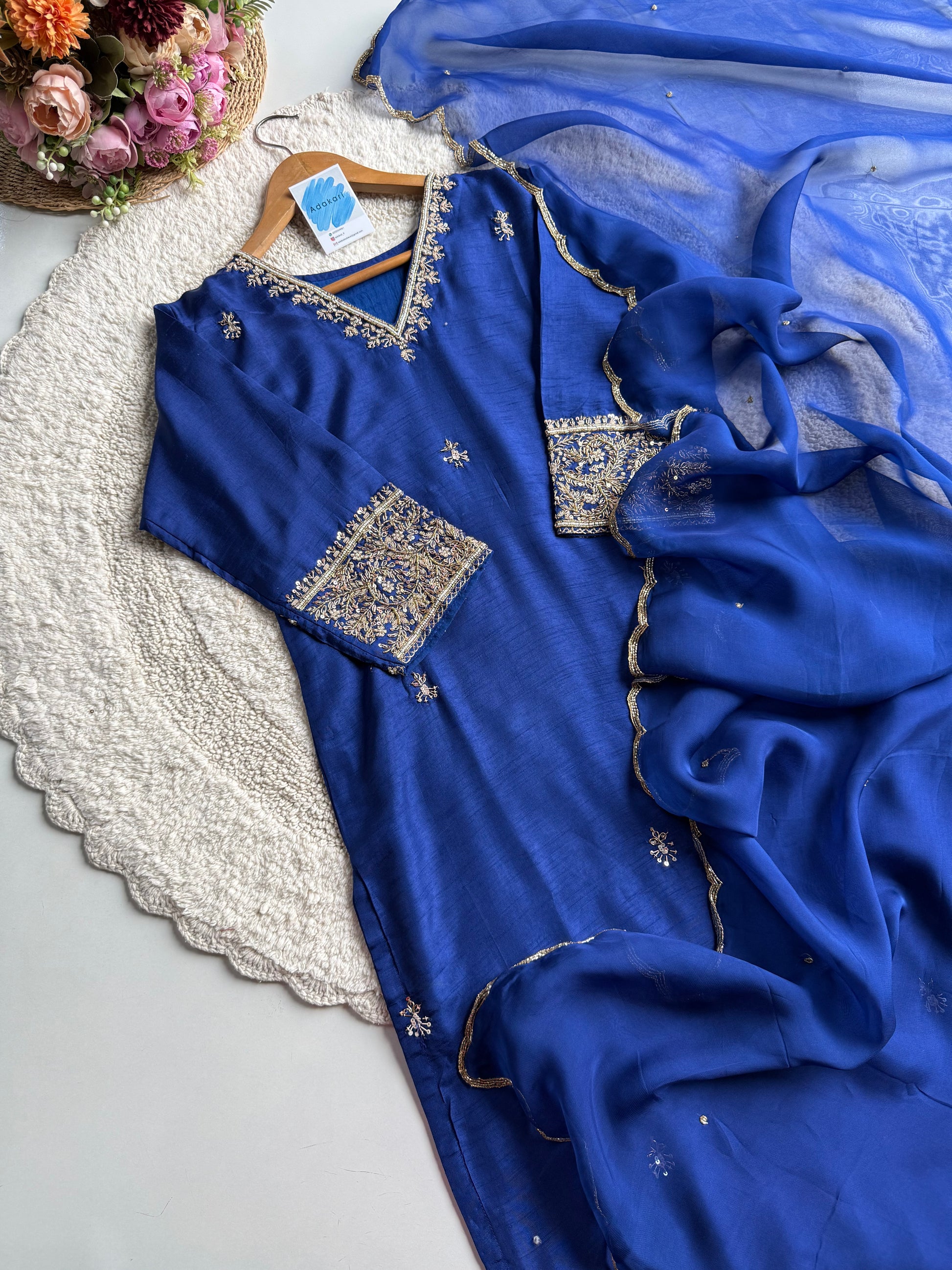 Experience timeless elegance with this premium handcrafted Dola Silk suit set in a stunning royal blue shade. The Kurta features intricate handwork on the neckline and sleeves, paired with a soft viscose organza Dupatta adorned with Kutdana highlight motifs and scalloped edges. Completed with a plain silk bottom, this set brings a luxurious, festive charm to your wardrobe
