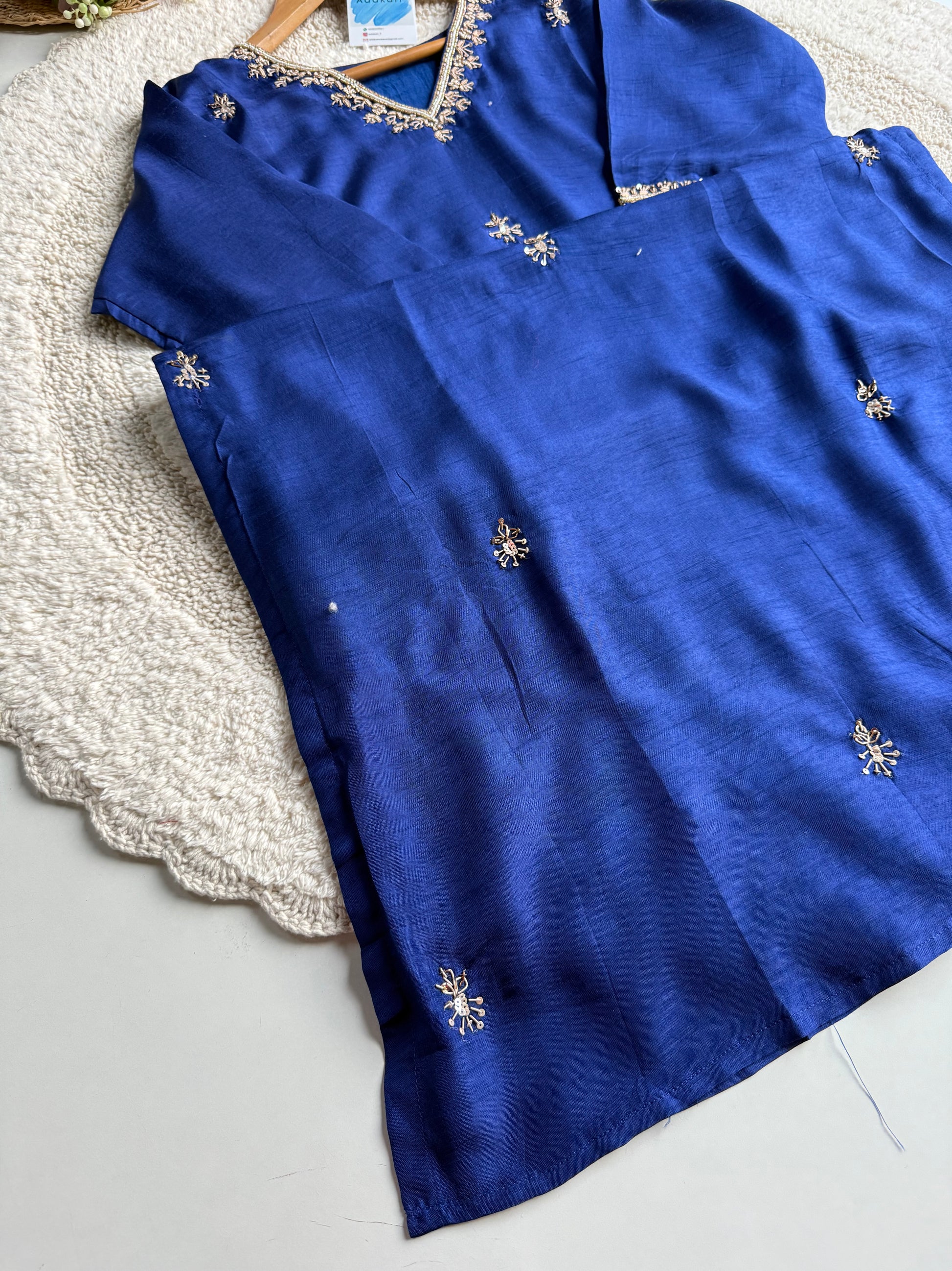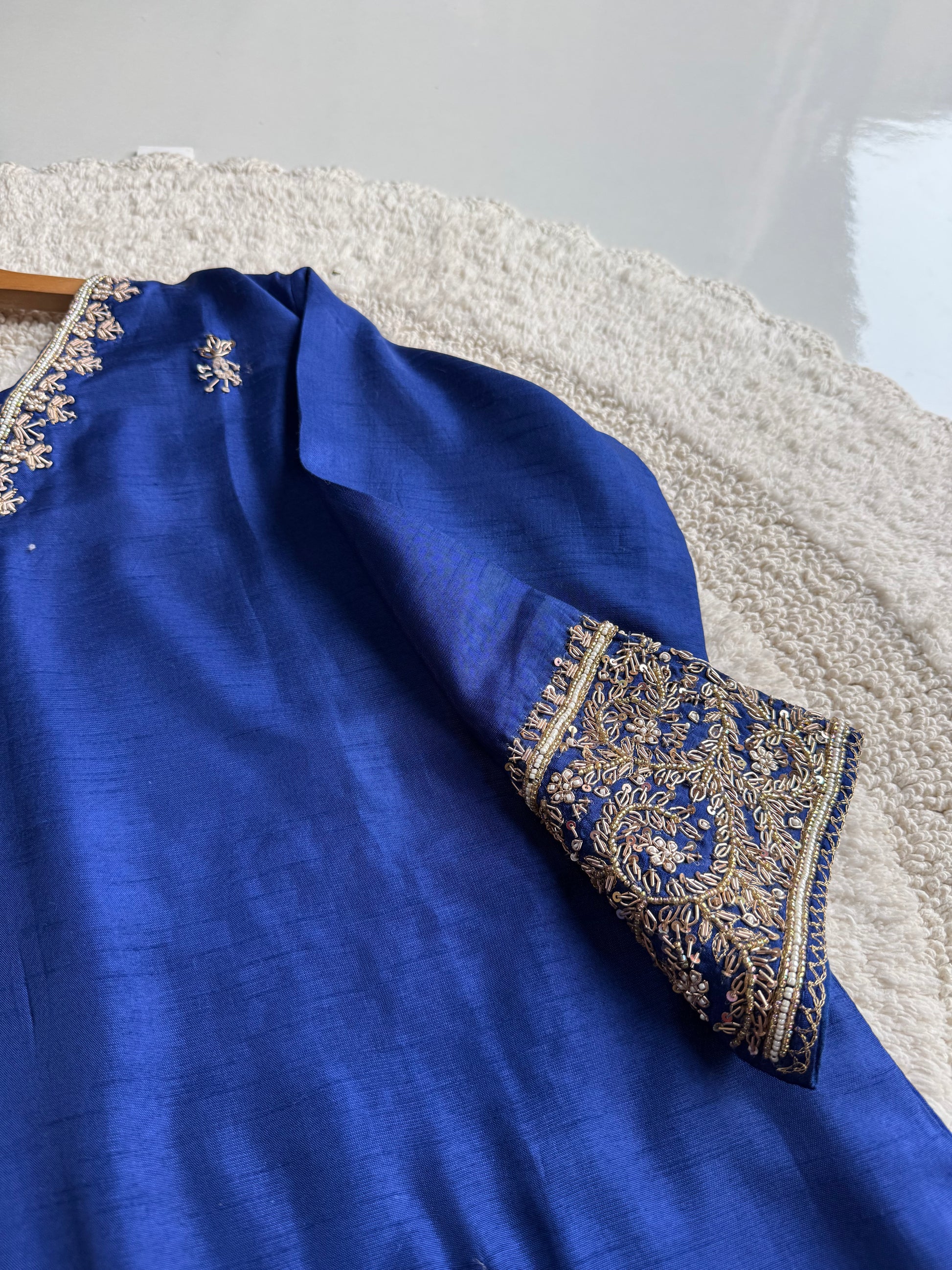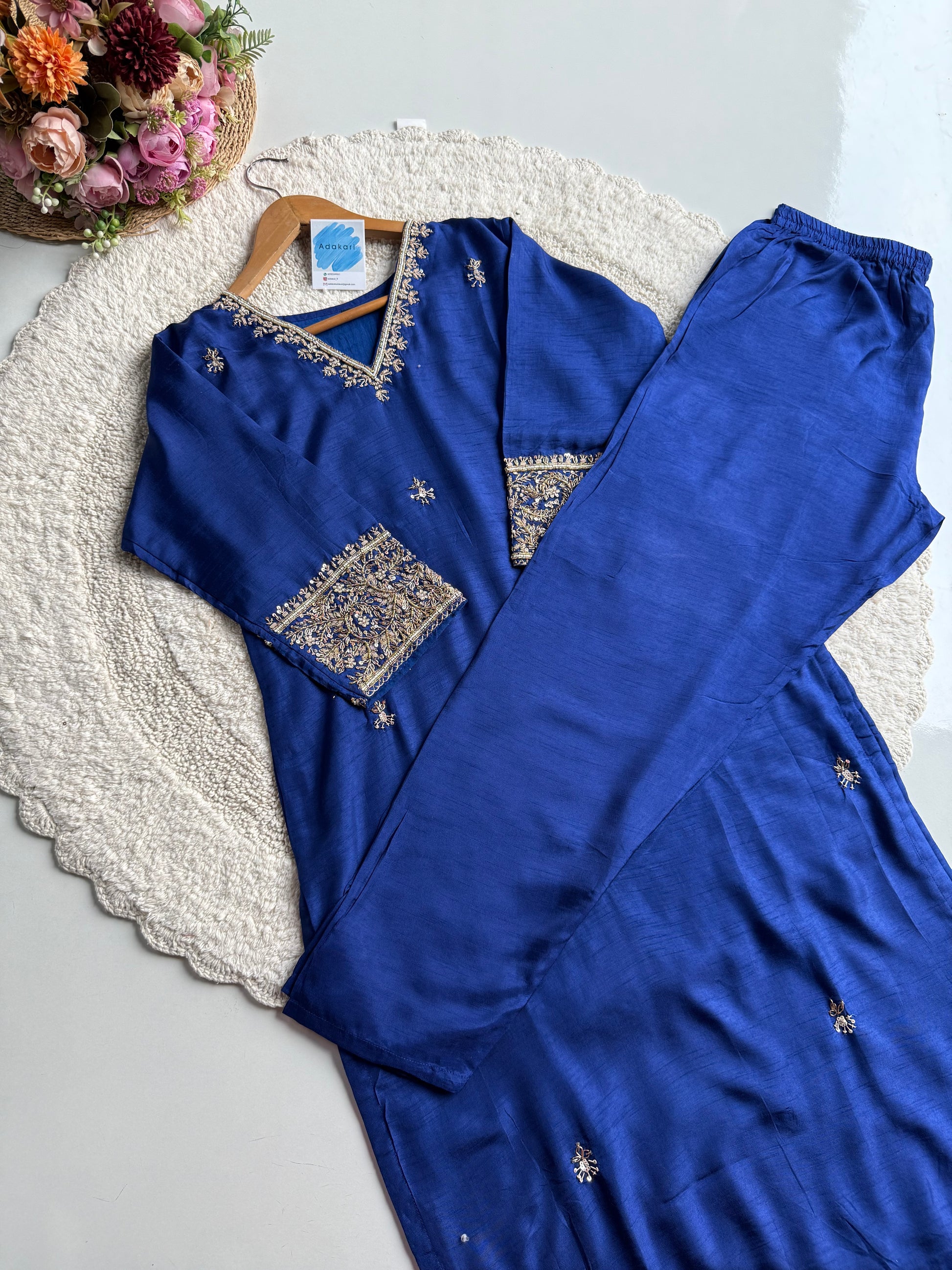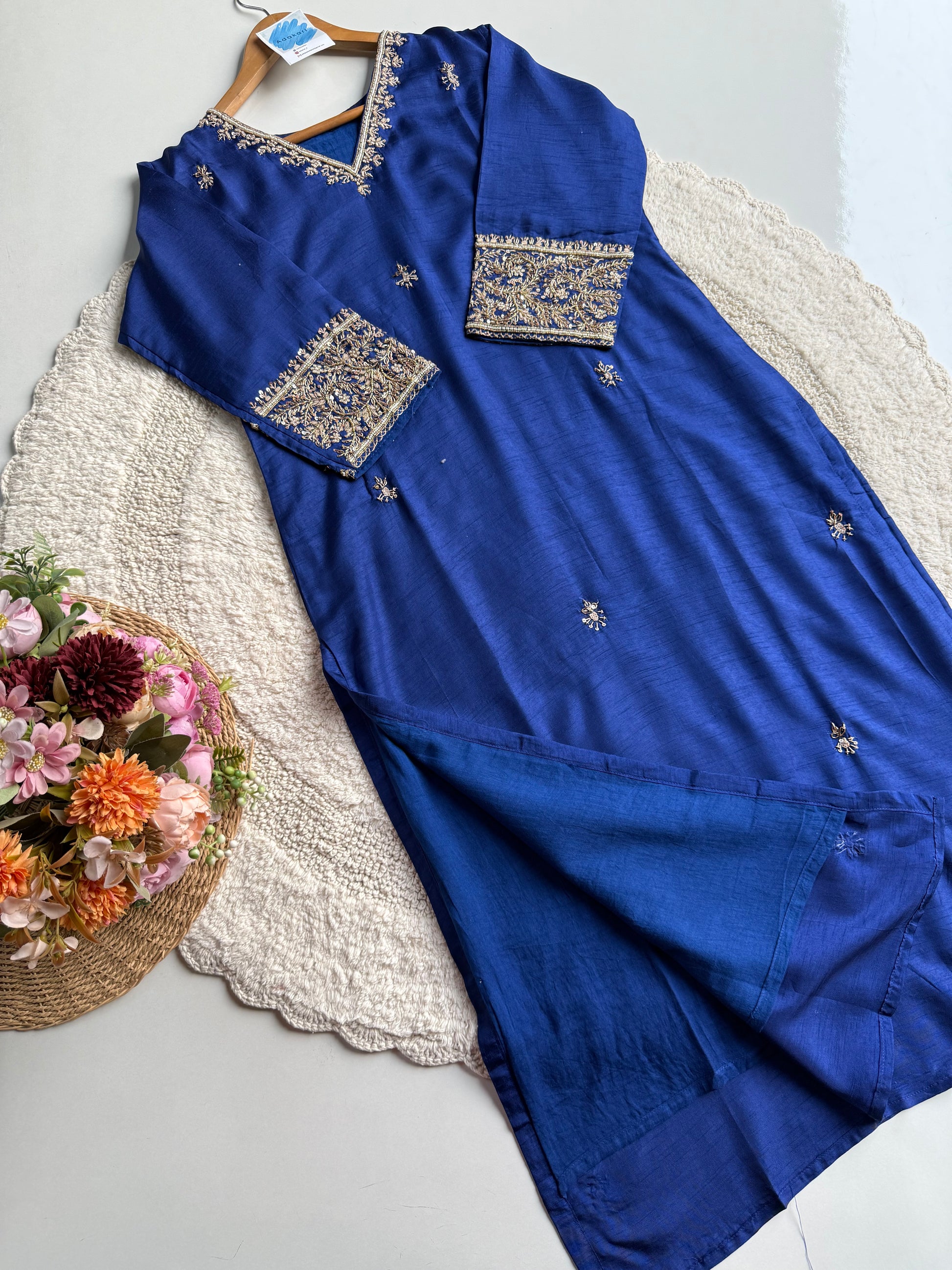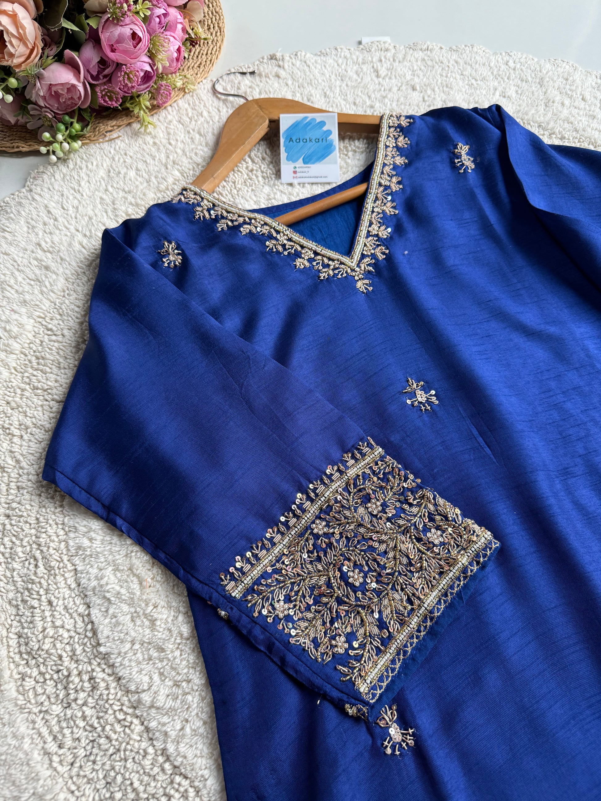 Experience timeless elegance with this premium handcrafted Dola Silk suit set in a stunning royal blue shade. The Kurta features intricate handwork on the neckline and sleeves, paired with a soft viscose organza Dupatta adorned with Kutdana highlight motifs and scalloped edges. Completed with a plain silk bottom, this set brings a luxurious, festive charm to your wardrobe